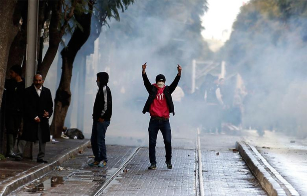 A protester gestures to police during a demonstration near the Interior Ministry in Tunis on 8 February 2013. Tens of thousands of mourners chanted anti-Islamist slogans on Friday at the Tunis funeral of secular opposition leader Chokri Belaid. (Photo: Zoubeir Souissi – Reuters)