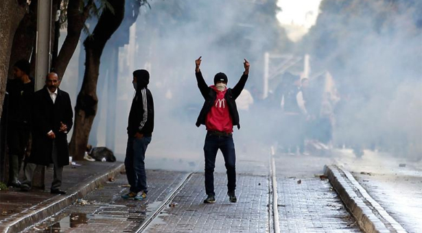 Tunuslu bir protestocu 8 Şubat 2013’te İçişleri Bakanlığı önündeki eylemde polise hareket çekiyor. Cuma günü laik muhalefet lideri Şükrü Belaid’in cenazesine katılan on binlerce kişi İslamcılara karşı sloganlar attı.