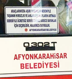 Haber: “Afyon Belediyesi, çarşamba ve cumartesi günleri kurulan pazar yerine parasız otobüs tahsis etti”. Basında geniş yer bulan bu haber ilk başta olumlu izlenimler edindiriyor. Ancak haberin çarpıcı kısmı devamını okudukça geliyor: “Parasız otobüsler sadece kadınlara tahsis edildi”. Bu kısımda bir “afallama” yaşanıyor, muhtemel “nasıl yani” sorusuna cevap AKP’li Afyon Belediye Başkanı Burhanettin Çoban’dan geliyor.