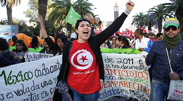 Ancak iki yıl sonra, devrimi ehlileştirmeye çalıştıkları ve yeni bir tür baskıcı, anti-laik, denetimci yönetim kurmak istedikleri düşünülen güçlere karşı devrimin kazanımlarını korumak için yaptıkları içsel mücadelerine büyük bir destek olacağı düşüncesiyle Tunus’taki devrimi başlatan gruplar tarafından davet edilen DSF, Tunus’ta toplandı.