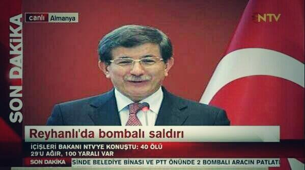 1-İçişleri Bakanı Muammer Güler, Reyhanlı’daki patlamalara ilişkin olayı gerçekleştirenlerin “Suriye’deki rejim yanlısı örgütlerle … irtibatlı oldukları tespit edildi” dedi.[7]