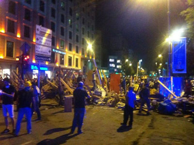 00:08 Barricades are up on the popular crowded central street Istiklal leading to Taksim Square. Fires are ablaze in the middle of the streets.