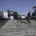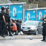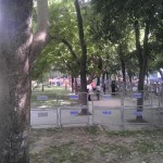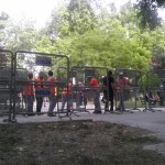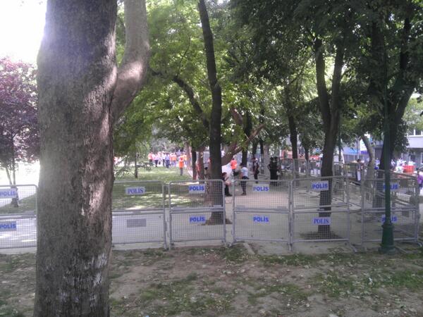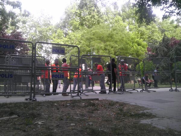 Gezi Parkı’nın etrafına kurulan bariyerleri polis, taşeron belediye işçilerine kurduruyor./ The policemen makes the subcontractor municipality workers to build the baricates around the Gezi park