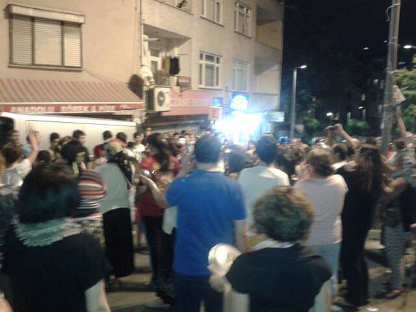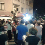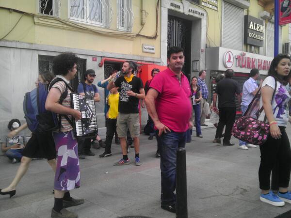 Gezi Parkı’nın yanında bir grup akordeonlari ve alkışları ile saldırıyı protesto ediyor./ A group protests the attacks with accerdions and cheers -nearby the Gezi park