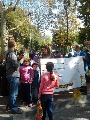 Milli Eğitim Bakanı Nabi Avcı’nın Ankara’daki bir ilkokulda çocukları savaşa özendiren kitap dağıtmasına tepkiler devam ediyor. Bugün (11 Ekim Cuma) saat 12.00’da Kadırga İlkokulu önünde toplanan Eğitim Dayanışması üyeleri okuldan çıkan öğrencilere barışı, dostluğu, kardeşliği öğrenecekleri kitaplar dağıttı. “Çocuklarımıza savaşı, kini, şiddeti ve öfkeyi değil barışı, dostluğu ve kardeşliği öğreneceği kitaplar getidik” yazılı pankartlarıyla okul önüne gelen Eğitim Dayanışması kitap dağıtımının ardından kısa bir açıklama yaptı.