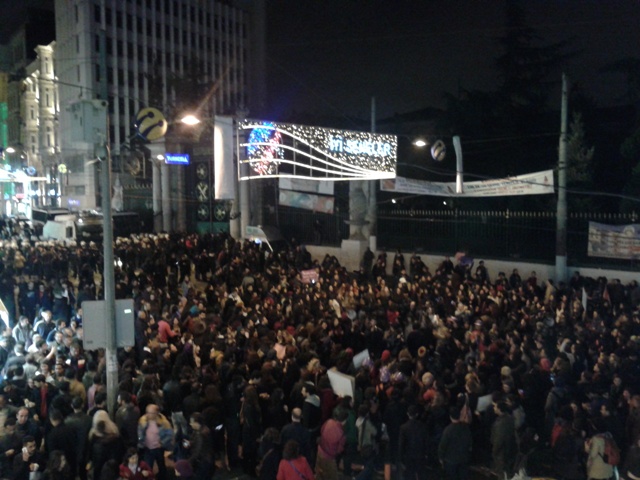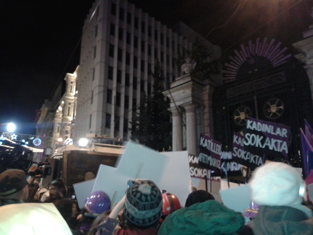 İstanbul’da Galatarasay Lisesi önünde 25 Kasım eylemi için toplanan yüzlerce kadın polis barikatıyla karşılaştı. Polis barikatına karşı oturma eylemi başlatan kadınlar, polisin engelleme çabalarına rağmen eylemlerini gerçekleştirdi
