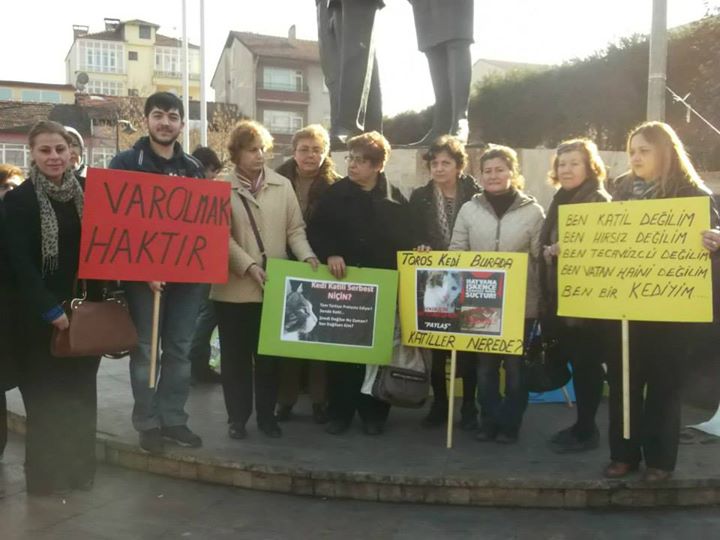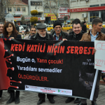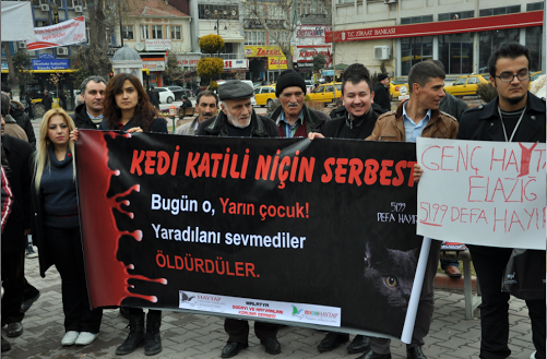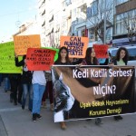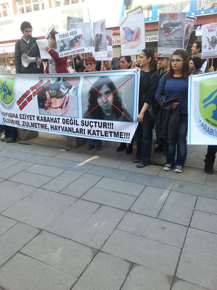 Bugün burada ve Türkiye’nin dört bir yanında merhamet ve vicdan taşıyan binlerce kişi bu vahşeti kınamak ve tek ses olarak ’Kedi katili serbest. Niçin?’ diye sormak için bir araya geldi. Evet, bir katil nasıl serbest kalır? Çünkü hayvana işkence vahşet, tıpkı yere tükürmek veya yasak yerde sigara içmek gibi basit eylemlerle aynı çizgide değerlendirilmiş ve ’Kabahat’ olarak görülmüştür. Dolayısıyla hakim veya savcı vicdanen istese de hayvanlara işkence uygulayanlara ceza vermemektedir. “