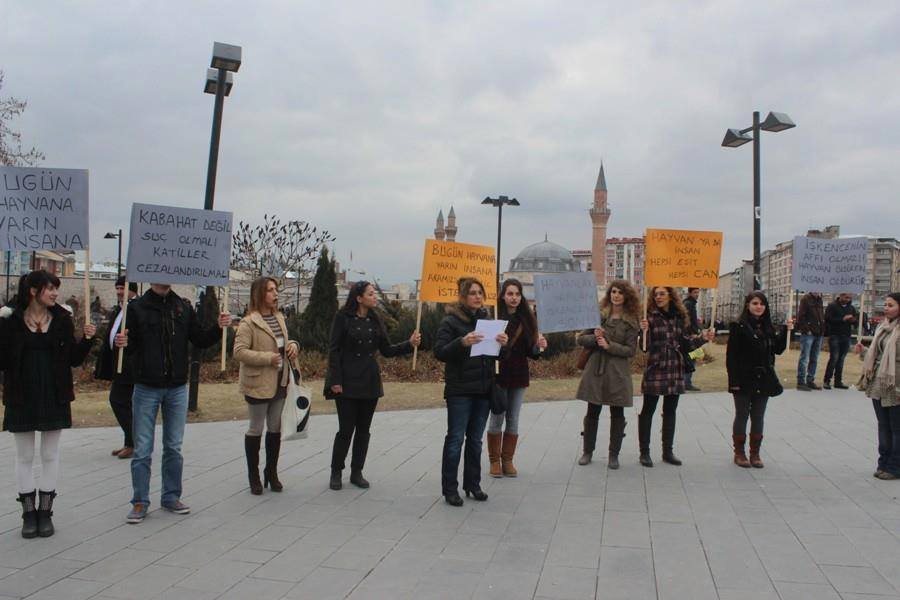 Konya’da hayvan hakları savunucuları işkenceye sesiz kalmadı. İnternet üzerinden örgütlenerek bir araya gelen hayvan hakları savunucuları Zafer Meydanı’nda buluştu.