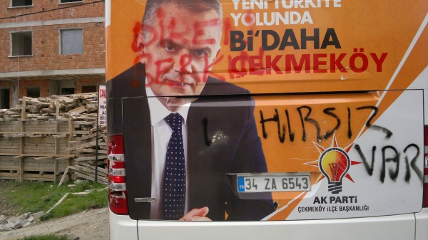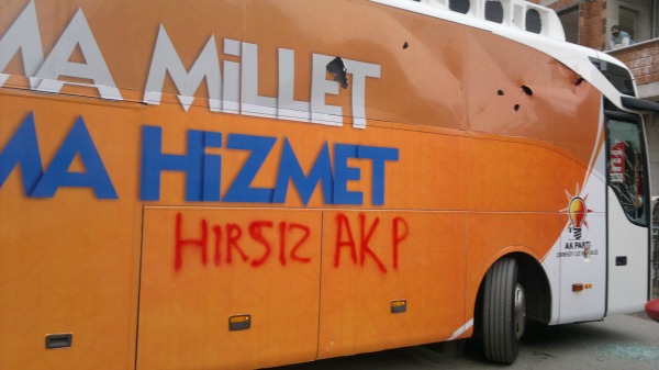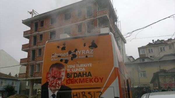 Sarıgazi Cemevi önünden bugün (7 Mart) saat 14.30 sularında geçen AKP seçim aracına devrimciler müdahale etti. Sarıgazili devrimciler mahallelerinde katillere, hırsızlara seçim çalışması yaptırmayacaklarını söyleyerek AKP aracını ve seçim çalışmalarını durdurdu. Araç ateşe verildikten sonra eylem sonlandırıldı.