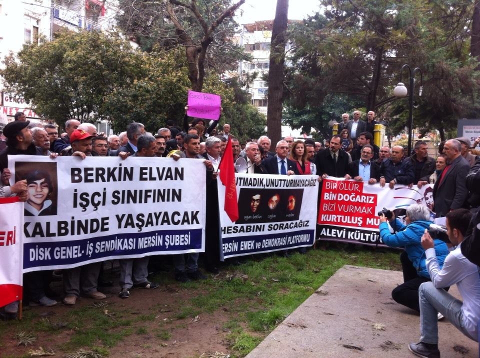 12.00 Tayyip Erdoğan’ın kentlerine gelişine karşı 12’de Özgür Çocuk Parkı’na toplanma çağrısı yapan Mersinliler parkta Berkin Elvan’la ilgili açıklamalar yapıyor. Polis helikopteri toplananların üzerinde uçuyor. Çevik kuvvet polisleri parkın etrafını sarmış durumda. Parkta yapılan açıklamalara, DİSK, Alevi Kültür Dernekleri, Mersin demokratik kitle örgütleri katılıyor.