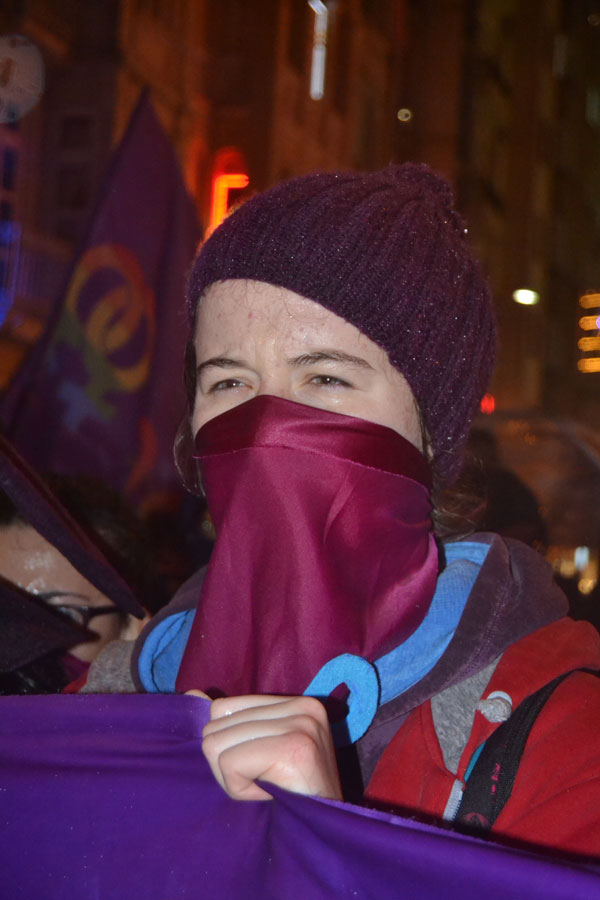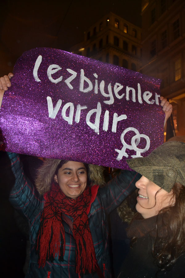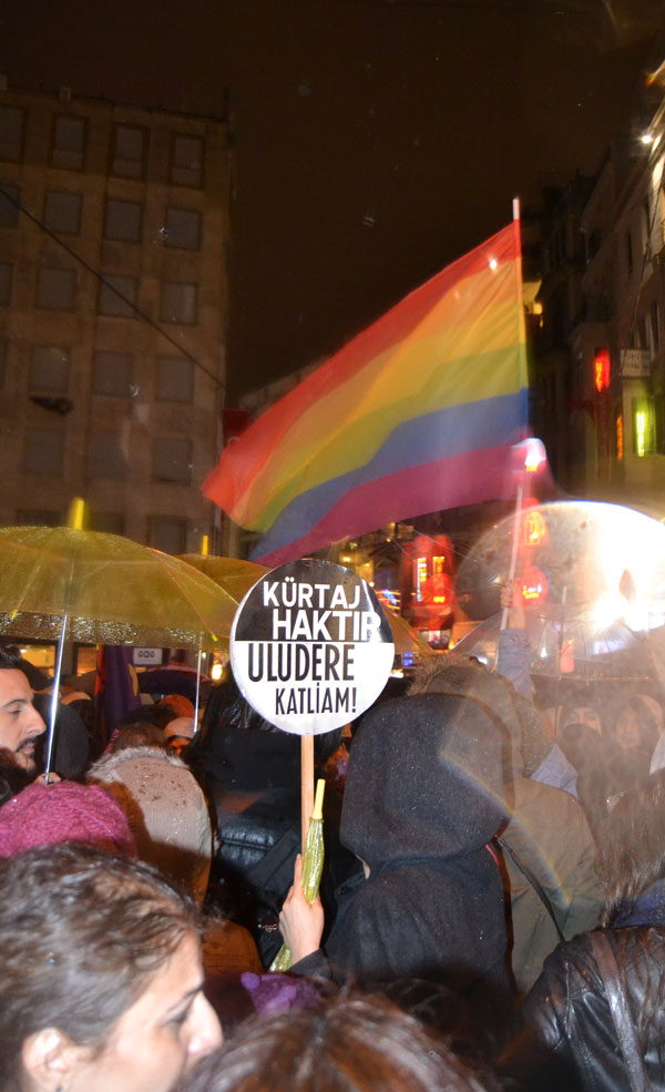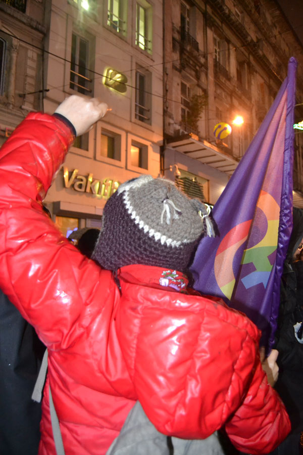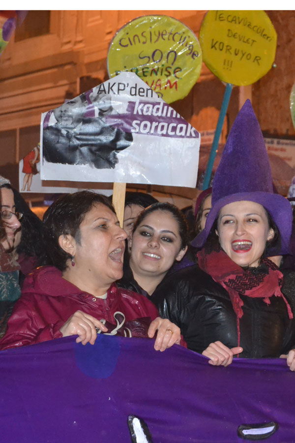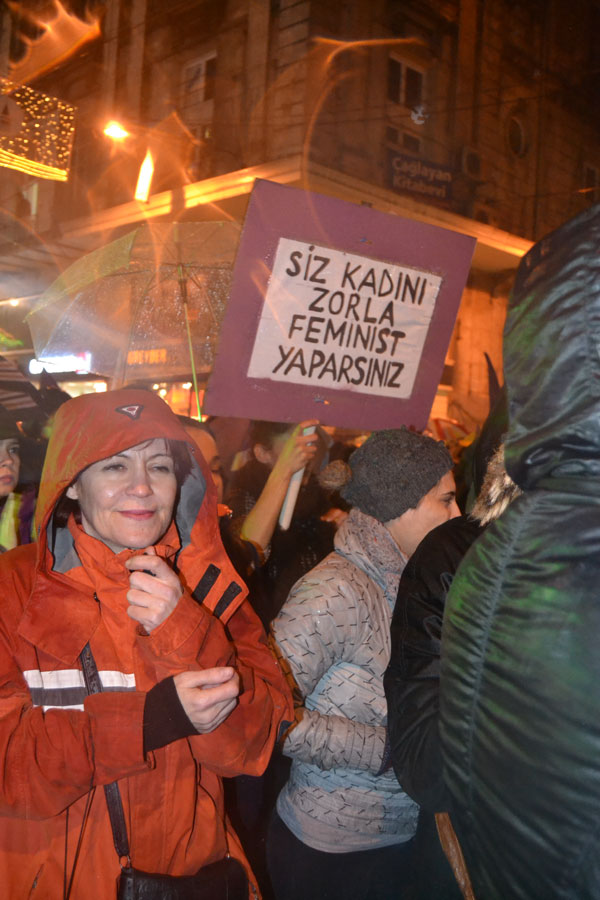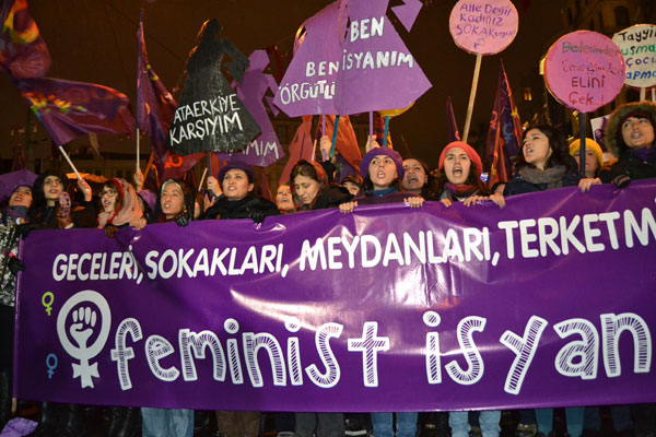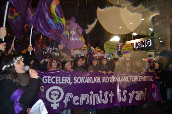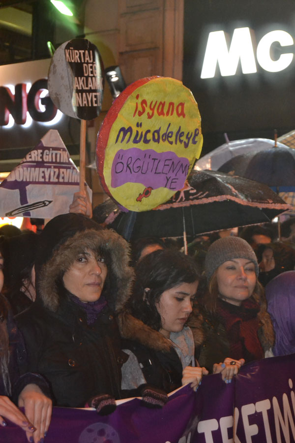 Binlerce kadının katıldığı yürüyüş, son yılların en kalabalık gece yürüyüşlerinden biri oldu. Feminalı flamaları, gökkuşağı bayraklarıyla, ‘İsyandayım’ yazılı kadın maketleri, dövizleri, mor baretleri ve baretlerine işledikleri çiçekleriyle kadınlar, AKP’nin kadını aileye hapseden politikalarına, erkek şiddetine, patriyarkaya, güvencesizleştirmeye, ucuz iş gücü olmaya, heteroseksizme karşı kürtaj hakkı için, “Emeğimiz, bedenimiz, kimliğimiz bizimdir” dedi.