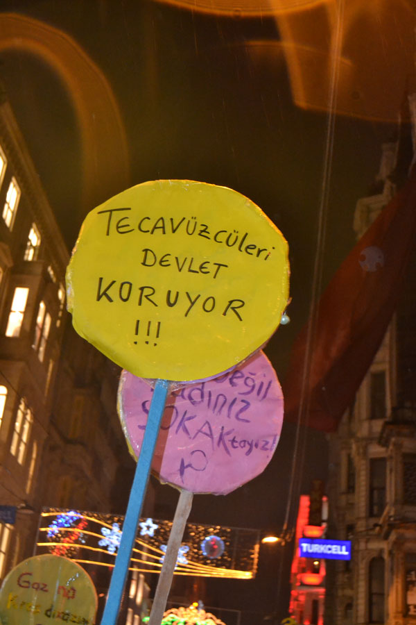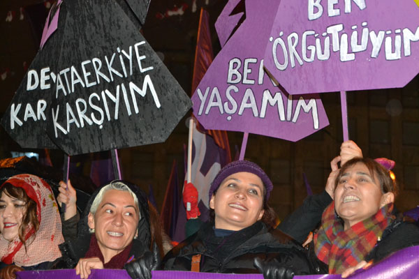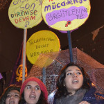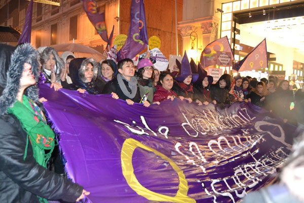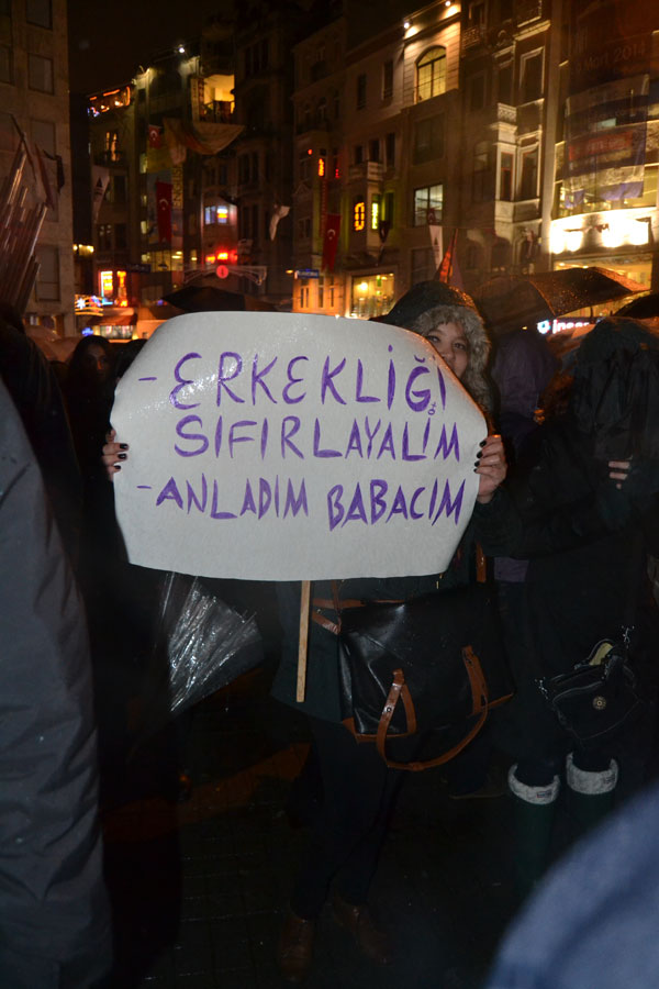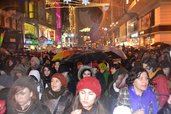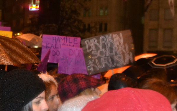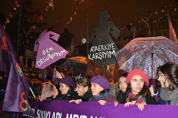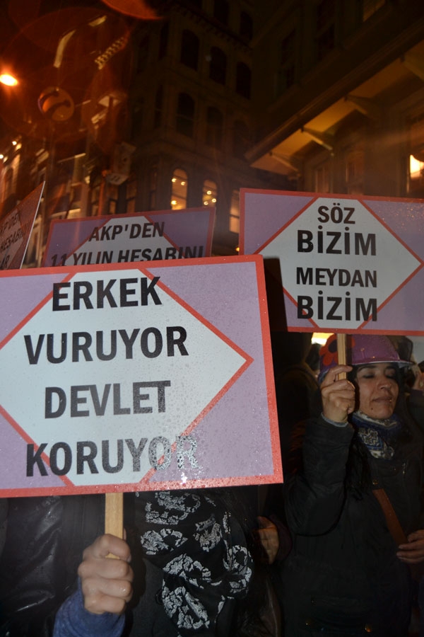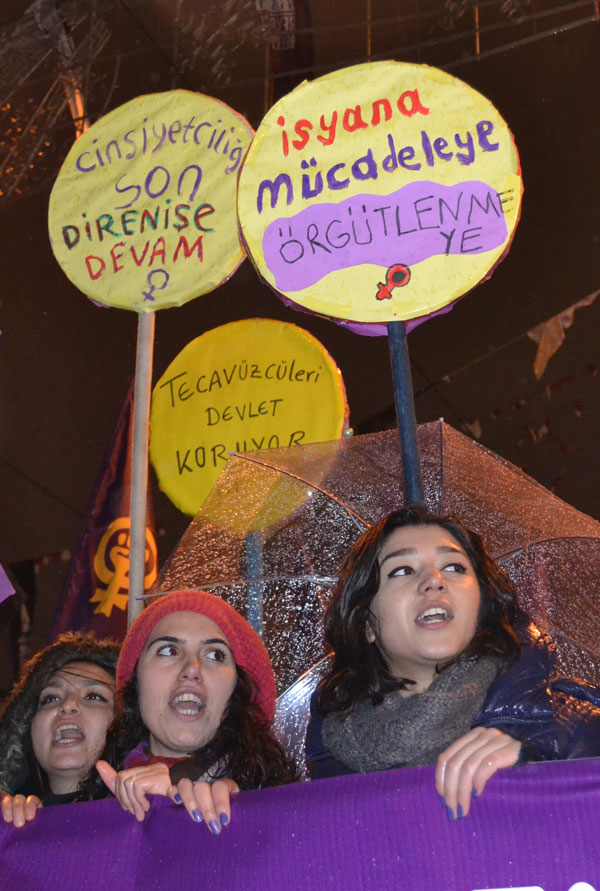 Gezi’den 8 Mart’a mücadeleyi taşıyan kadınlar daha yürüyüşe başlamadan “Bu daha başlangıç mücadeleye devam” ve “Her yer Taksim her yer direniş” sloganları da attı. Özellikle Gezi’de artan polis ve devlet şiddetini de protesto eden kadınlar, tecavüzcüleri ve kaıdn katillerini koruyan erkek egemen yargıyı da eleştirdiler.