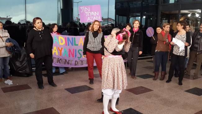 Olbia önünde Kürtçe ve Türkçe okunan basın açıklamasının ardından, İstanbul’da eski erkek arkadaşı tarafından öldürülen üniversite öğrencisi Özge’yi için de açıklama yapan üniversiteli kadınlar, düzenlenen tiyatro ile etkinliği şenliği sonlandırdı.
