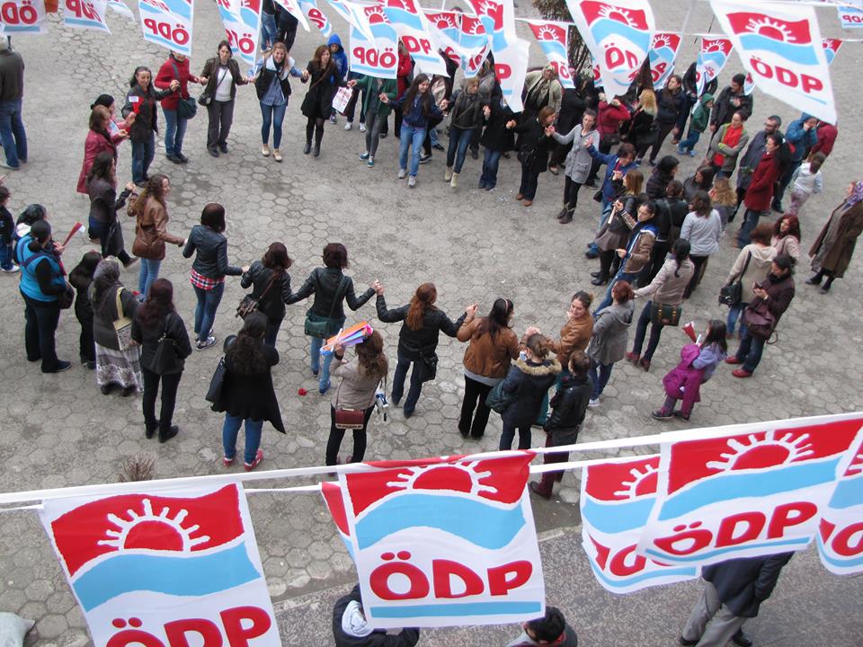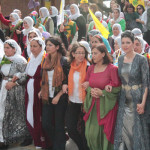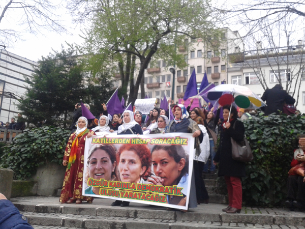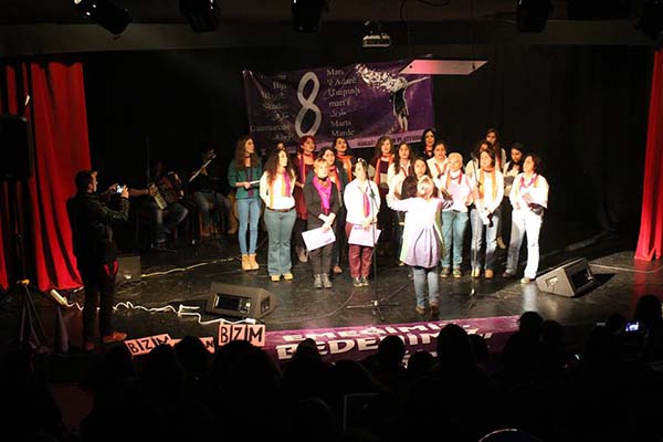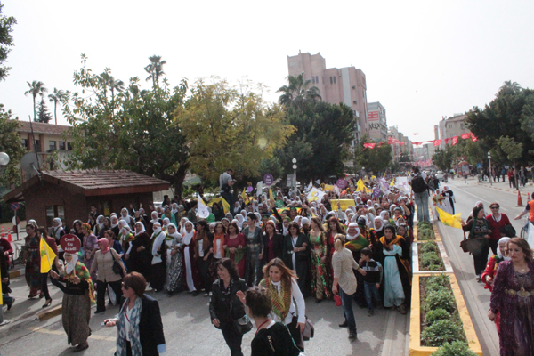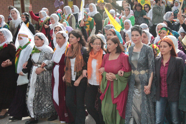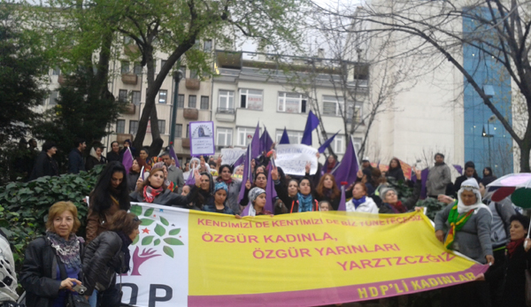 Sevgili kızkardeşlerim, yıllardır bu topraklarda özgürlük için, barış için, eşit yurttaşlık için, AKP’nin karanlığına meydan okumak, gerici, faşist iktidardan kadınlar olarak hesap sormak için alanlardayız. Bu ülkenin başbakanı diyor ki ‘Ben kadın erkek eşitliğine inanmıyorum, kadın zaten erkeğin tamamlayıcısıdır.’ Onlar böyle konuştukça bizler daha fazla öldürülüyoruz, daha fazla şiddete maruz kalıyoruz. İsyan için en çok bizim nedenimiz var. Yıllardır açılım yalanlarıyla savaşı örgütlediler, bizler canımızdan olduk. Özde savaş, sözde barış dediler bizim canlarımız, çocuklarımız gitti. Onların çocukları bizim emeğimizden çalarken, Roboski’de cep küçük çocuklarımızı kaçakçılık yapıyorlar diyerek öldürdüler. Onlar 11 yıldır ayakkabı kutularını nasıl dolduracaklarının hesaplarını yaparken biz daha fazla öldürüldük, biz daha fazla güvencesiz koşullarda çalışmak zorunda kaldık, biz daha fazla işsizleştik, küçük yaşta kız çocuklarımız daha fazla çocuk gelin oldu. O yüzdendir ki 8 Mart mücadele günüdür ve mücadele için bir başlangıç günüdür.