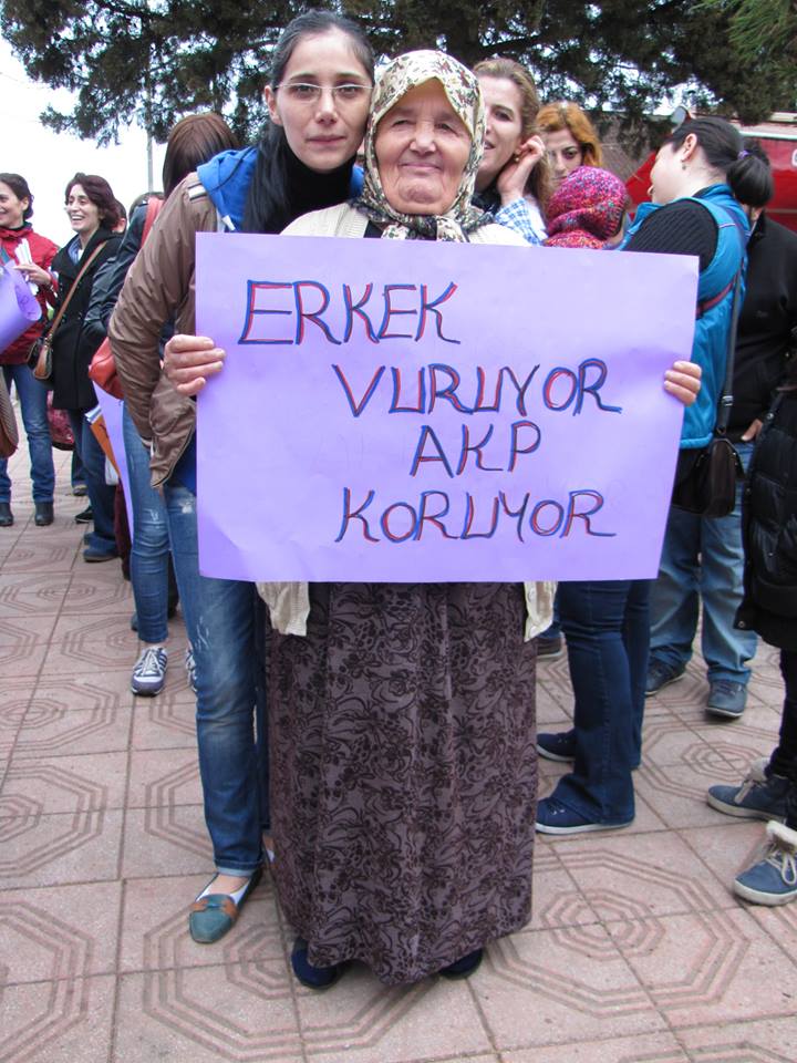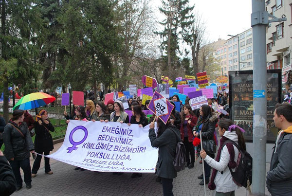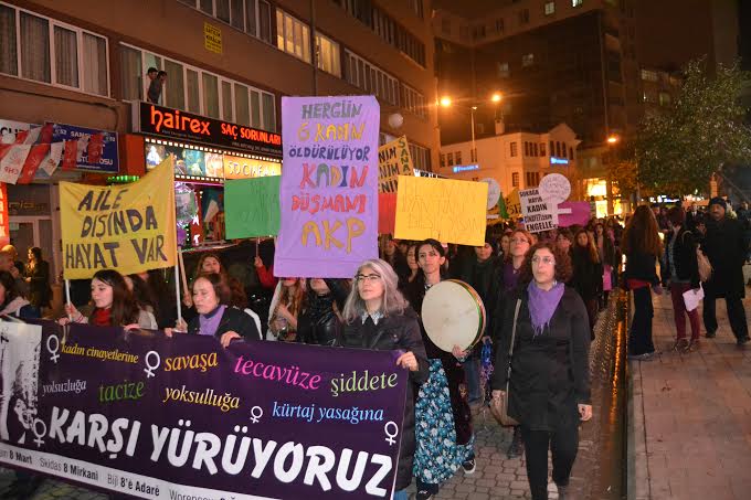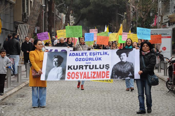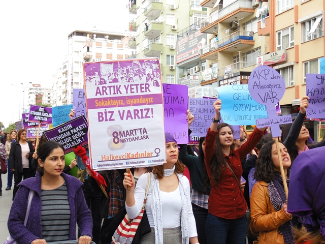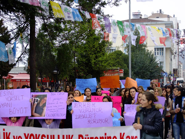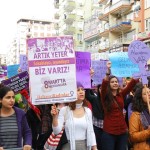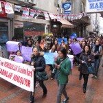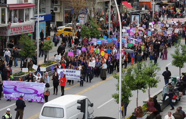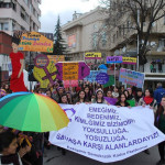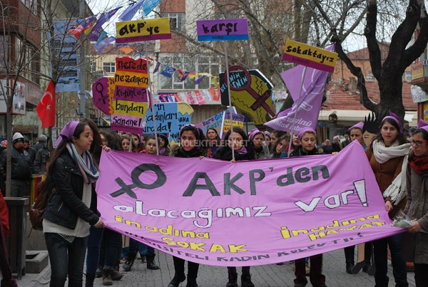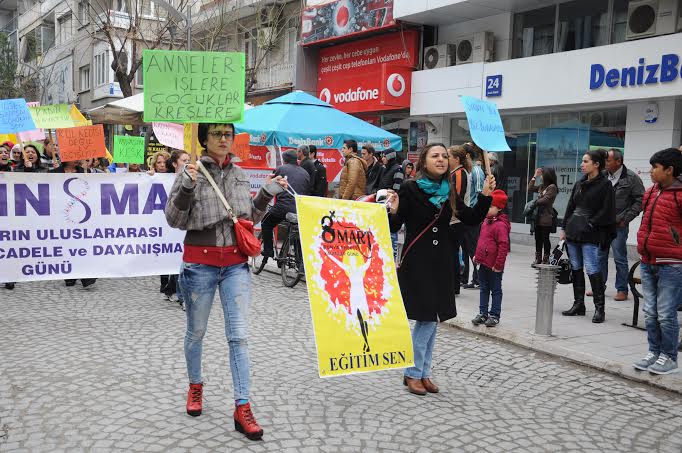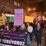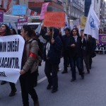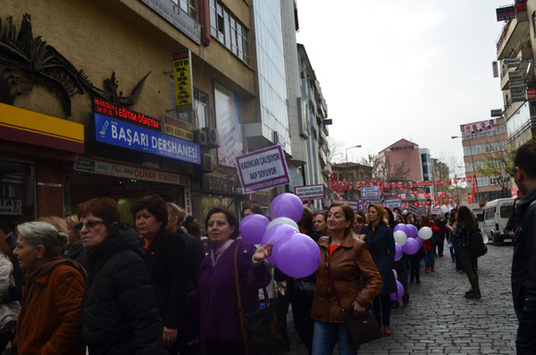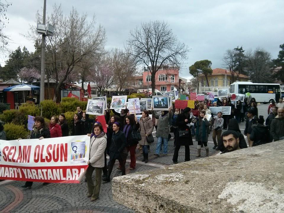 Çanakkale’de eski salı pazarı önünde saat 13.00’da toplanan yüzlerce kadın Cumhuriyet Meydanı’na doğru yürüyüş yaptı.Yürüyüş boyunca ”AKP’den hesabı kadınlar soracak”, “Devlet elini bedenimden çek”, “Kadınların isyanı AKP’yi yıkacak” sloganları atıldı.