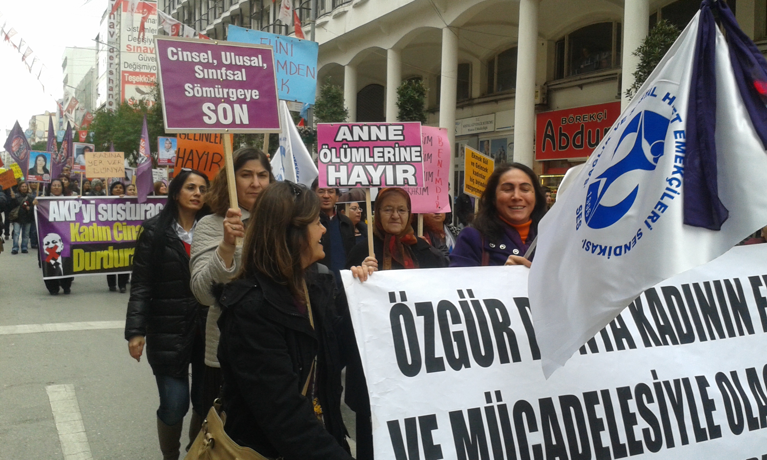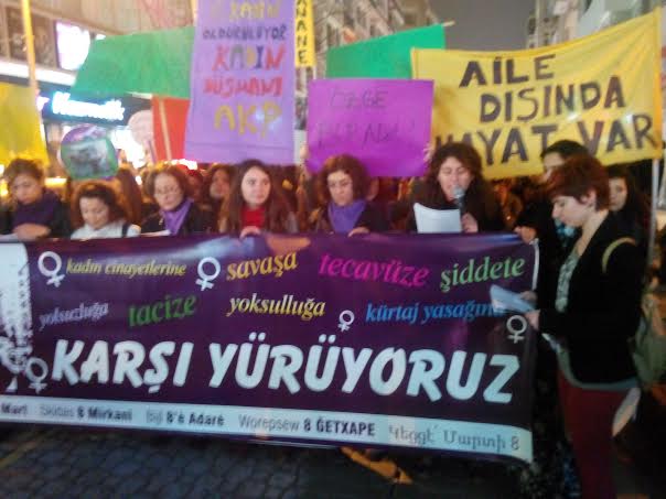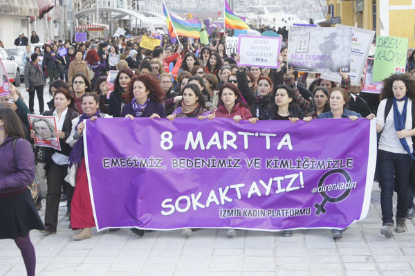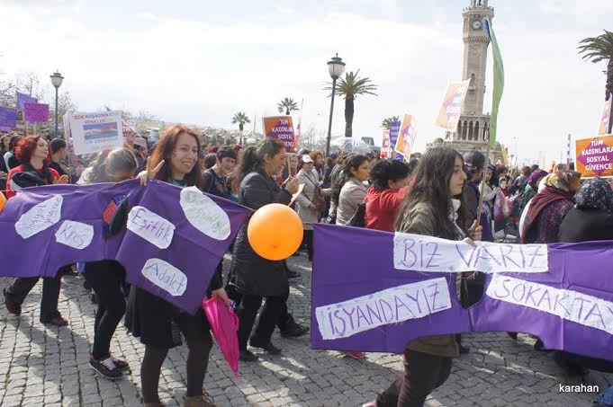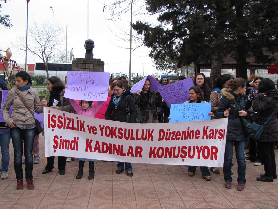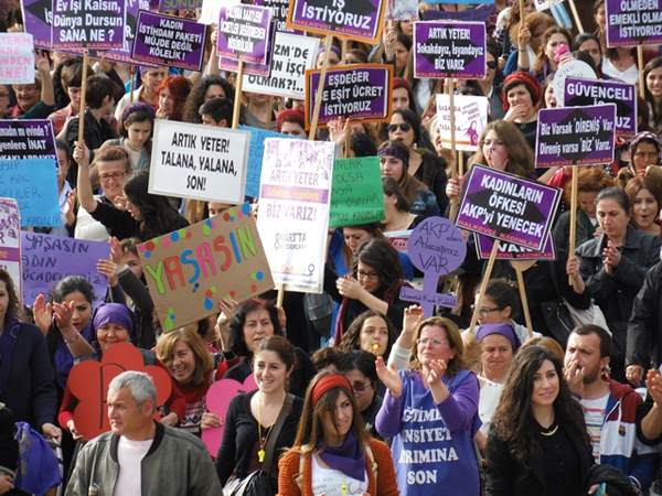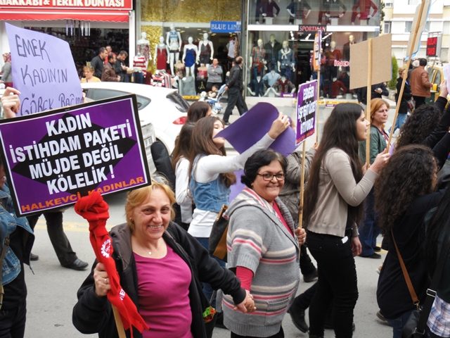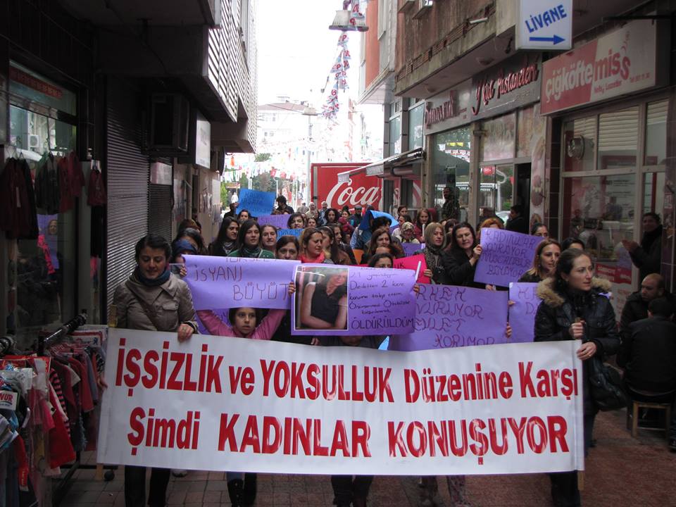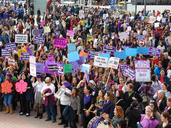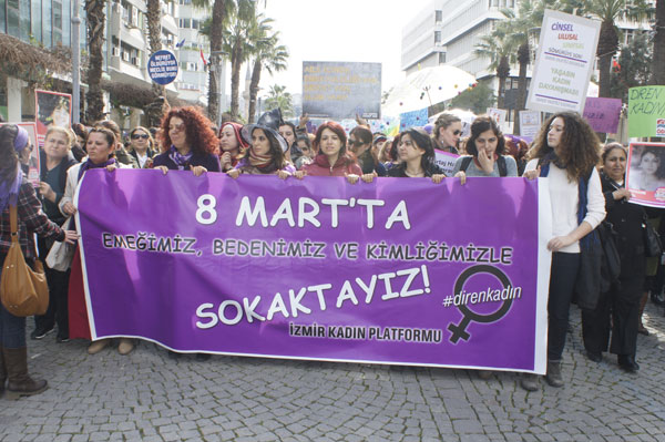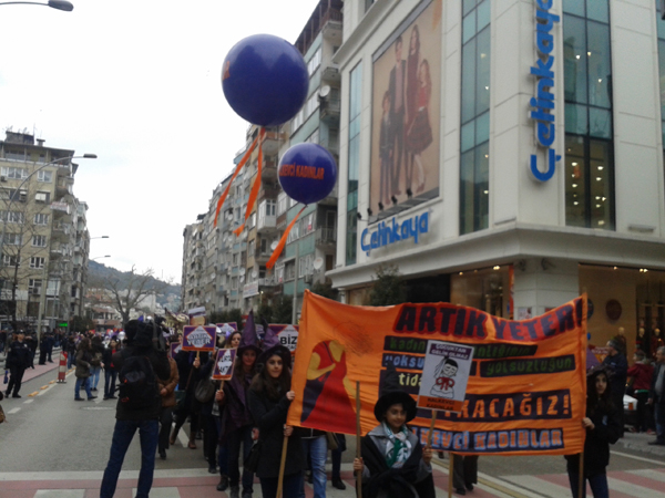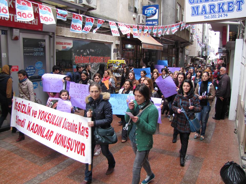 İzmir Kadın Platformu’nun çağrısıyla bir araya gelen kadınlar Konak YKM önünden Gündoğdu Meydanı’na yürüdü.Yürüyüş boyunca “Kadınlar yürüyor, direniş büyüyor “,”Hırsızlardan hesabı kadınlar soracak “, “Tayyip kaç kaç kaç, kadınlar geliyor” sloganları atıldı