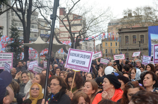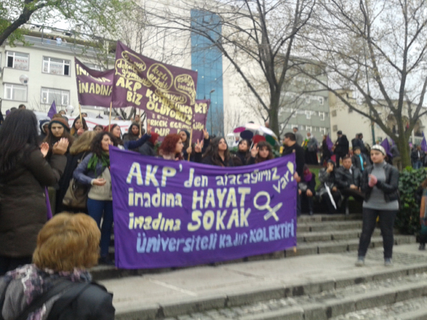 Yürüyüş güzergahında bulunan ve polislerin barikat kurduğu AKP seçim bürosu önünde duran yüzlerce kadın ”Hırsız var” sloganı attı. Miting alanında yapılan ortak basın açıklamasında “Gezi’de çocuklarını kaybeden annelerimiz için burdayız, daha dün öldürdüğünüz Özge için burdayız, AKP’nin kadını yok sayan politikalarına karşı burdayız” diyerek her alanda yapılan kadına baskı ifade edildi. Basın açıklaması “Yaşasın 8 Mart yaşasın mücadelemiz” sözleriyle sonlandırıldı.