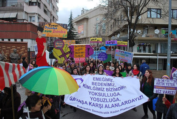 Eskişehir Demokratik Kadın Platformu çağrısıyla Yediler Parkı’nda bir araya gelen kadınlar,renkli kortejleriyle, sloganlarıyla,şarkılarıyla 8 Mart Dünya Kadınlar Günü’nü kutladı.Eskişehirli kadınlar, her 8 Mart’ta olduğu gibi bu 8 Mart’ta da kadın mücadelesini büyüterek eşitlik talebiyle isyanlarını haykırdılar.