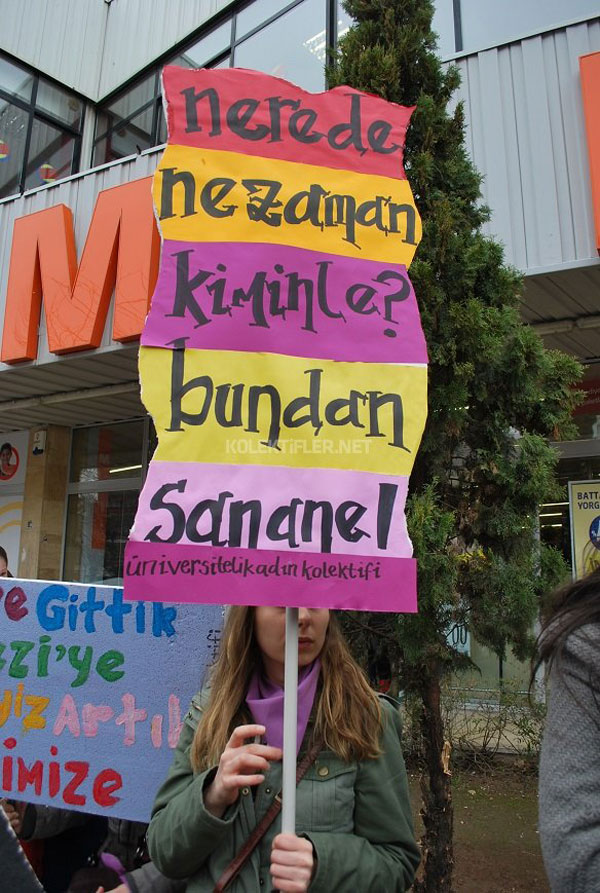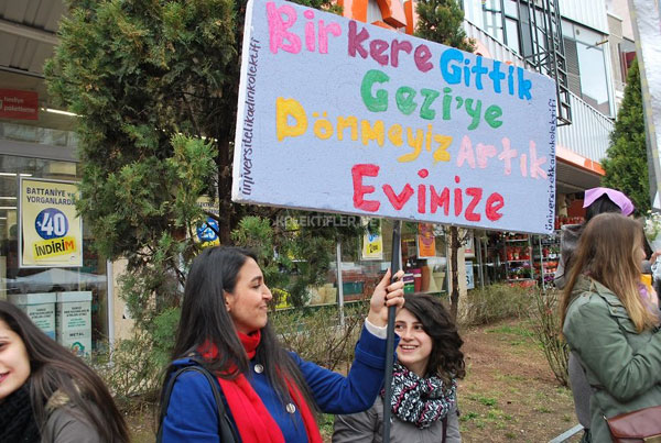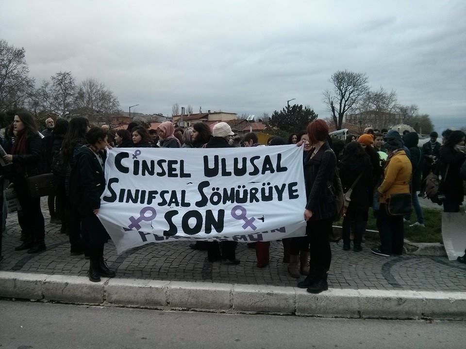 Önceki gün Eskişehir’de Recep Tayyip Erdoğan’ın düzenlediği mitingi protesto edenlerin arasında bulunan Üniversiteli Kadın Kolektifi üyesi olan 20’ye yakın kadın gözaltına alınmıştı. Gözaltına alınırken ve alındıktan sonra polis şiddetine ve tacizine maruz kalan üniversiteli kadınlar, “Gözaltında tacize,tecavüze son” sloganıyla yaşananların hesabını soracaklarını belirterek, öfkelerini 8 Mart’ta sokağa taşıdılar.
