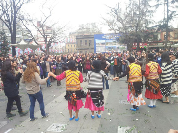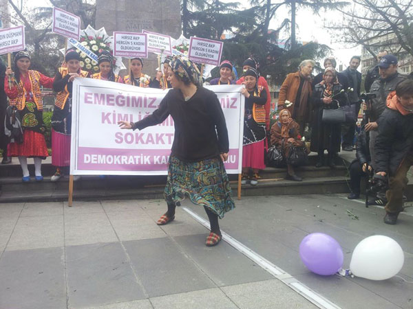 8 Mart Dünya Kadınlar Günü’nde, kadın düşmanı AKP’den hesap sormak için sokağa çıkan Trabzon Demokratik Kadın Platformundan kadınlar saat 14.00’da merkez postane önünde toplanmaya başladı. Kadınlar burada sloganlar atıp horonlar oynayarak coşkulu bir şekilde yürüyüşe geçti. Yürüyüşe geleneksel horon kıyafetleriyle gelen kadın ekibi ve döviz tutan yaşlı teyzeler oldukça ilgi çekti. Yürüyüş esnasında hep bir ağızdan şarkılar söyleyip sloganlar atan kadınlar coşkularını eylem alanına kadar sürdürdüler. Kadınlar, daha iki gün önce öldürülen Özge’nin hesabını soracaklarını, katiller hesap verene kadar sokakları terk etmeyeceklerini söyledi. Yürüyüş boyunca “ Erkek vuruyor; devlet koruyor.” “Kadınlar çalışıyor; AKP soyuyor” “AKP’den hesabı kadınlar soracak” ve “Yasta değil isyandayız” sloganları atan kadınlar meydan parka vardıklarında bir basın açıklaması gerçekleştirdi. Basın açıklamasında son dönemde artan kadın cinayetlerine ve AKP’nin gerici söylemlerine vurgu yapan kadınlar açıklamanın ardından bir buçuk saat boyunca alanı terk etmeyip şiirler okudular, kadın olmayı iki dakikada anlatan bir skeç oynadılar ve ardından horonlar oynayıp şarkılar söyleyerek eylemi sonlandırdılar. Eyleme ve oynanan horonlara çevredekilerin katılımı yoğundu.