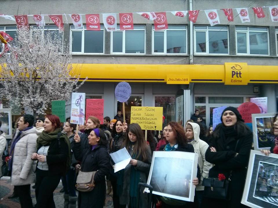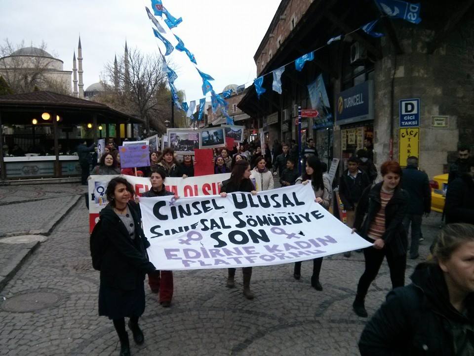 Edirne’de kadınlar “Cinsel-ulusal-sınıfsal sömürüye son! ve “Selam olsun 8 Mart’ı yaratanlara” pankartıyla yürüdü. Renkli dövizlerle ve fotoğraflarla yürüyüş gerçekleştiren kadınlar Saraçlar PTT önünde basın açıklamsı yaptı. Kadınlar basın açıklmasında Erdoğan’ın “Kadın erkek eşit değildir” sözlerini, aileyi güçlendiren politikalarını, kürtaj yasağını, üç çocuk doğurun isyanını hatırlatarak başladı. Kadınları yaşamın dışına itmeye çalışanlara karşı mücadele etmeye devam edeceklerini belirten kadınlar basın açıklamasını halaylar ve türkülerle sonlandırdı.