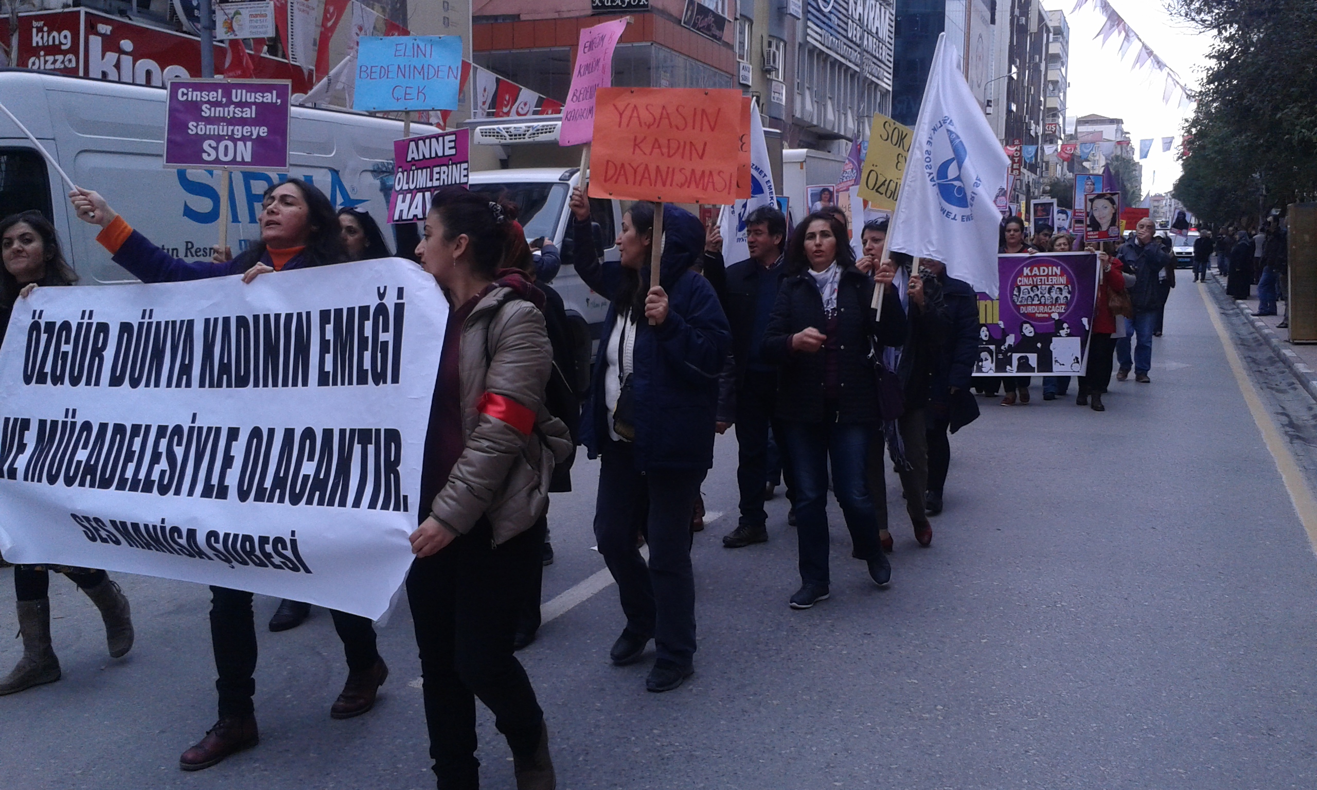 Manisa Kadın Dayanışması’nın çağrısıyla 14.00’da Cumhuriyet alanında toplanıldı. Kadınlar Cumhuriyet alanından Ulupark’a kadar yürüdü. Uluparkta Dayanışma adına basın açıklamasını SES Manisa Şube Kadın Sekreteri Bedriye Üneri okudu. Üneri, “Öldüren sevgi istemiyoruz”, “Erkek adalet değil gerçek adalet”, “Evde, işte sokakta tacize son” diyerek basın açıklamasını tamamladı. Açıklamanın ardından aynı yerde kadın forumu yapıldı.
