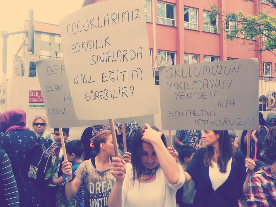 Çekmeköy’de 22 Mayıs Perşembe günü okul önünde öğlen saatinde bir araya veliler, 2 yıl önce verilen yıkılma yada güçlendirme kararının sürekli ertelenmesinden ve çocuklarının risk altında eğitim görmesine tepki gösterdi.