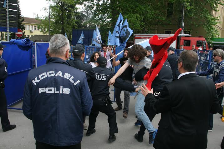 14.24 Kocaeli’de polis üniversitelilerin Berkin dövizini almak istedi. Üniversiteliler dövizleri vermediği için polis tarafından gözaltına alınmak istendi. Çevik kuvvetler de arama noktasına gelirken çıkan arbedeye rağmen miting alanına girildi.