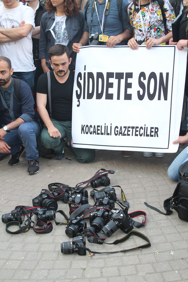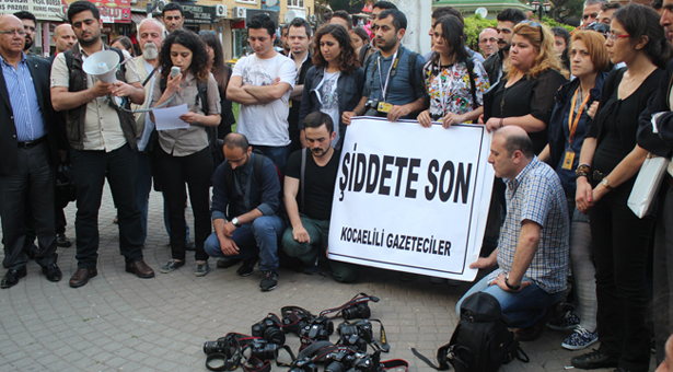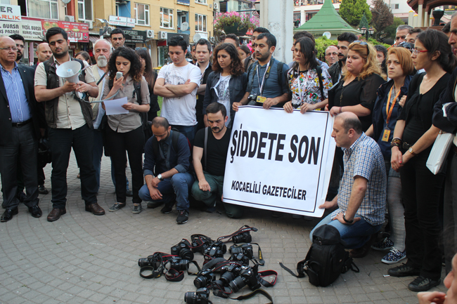 Soma’da meydana gelen maden katliamında ölen işçiler için Kocaeli’de dün (14 Mayıs) yapılan eylemde polisin direnişçilere yönelik saldırısını belgeleyen basın emekçileri darp edildi. Basının çekim yapmasını engellemek isteyen polis, copla, tekmeyle, yumrukla saldırdı. Darp edilen basın emekçileri bugün (15 Mayıs) suç duyurusunda bulundu.
