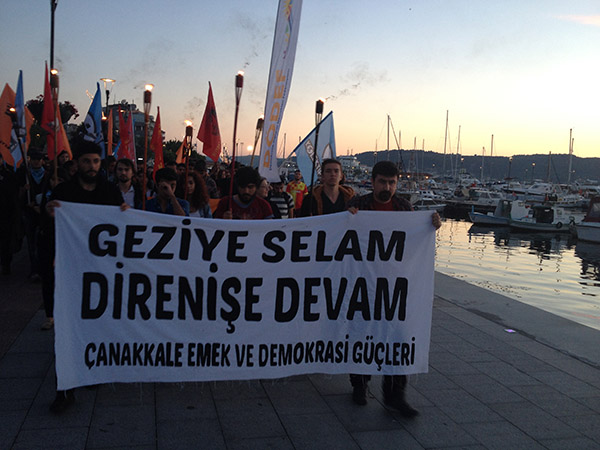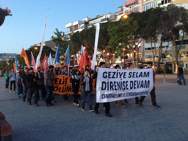 Forumdan sonra kitle, ellerinde meşalelerle Kordon’dan Golf Çay Bahçesi’ne yürüdü. “Elif Çermik ölümsüzdür” ve “Gezi’ye selam direnişe devam” pankartları açan Çanakkale Emek ve Demokrasi Güçleri, çay bahçesinden ise İskele Meydanı’na yürüdü.