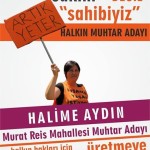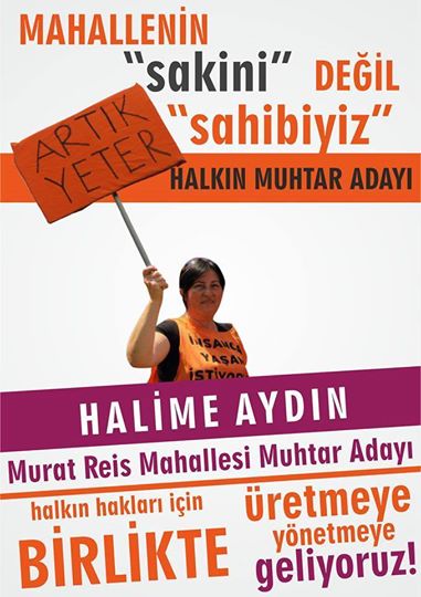 Konak Halkevi yöneticisi olan Halime Aydın geçtiğimiz yerel seçimlerde “Dünyaya kadınlara daha yaşanır bir hale getirmek için önce mahallemizden başlayalım” diyerek İzmir Hatay semti Murat Reis Mahallesi’nde halkın muhtar adayı olmuştu.