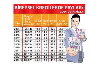Özellikle uzun vadeli konut kredilerinin kullandırılmaya başlandığı 2005 sonrasında toplam bireysel kredilerde konut borçlanmaları aile borçlanmalarının üçte birini oluşturdu. Otomobil kredileri de ilk yıllarda yüzde 8-9 paya sahipken sonraki yıllarda toplamdaki payı yüzde 3’lere düştü. Demek ki, hanehalkı borcu denildiğinde yüzde 36-37’sinin konut ve otomobil almak için yapılan borçlanmalar olduğunu anımsamak gerekir. Bunlar, bir geçim sıkıntısı sonucu başvurulan borçlanmalar değil; belli bir gelir akışı olanların yaptığı borçlanmalardır, ayrı tutmak gerekir.