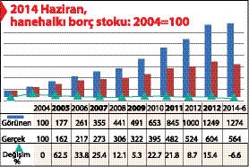 Hanehalkı borç yükü ile sıkça yapılan yanlışlardan biri, borç yükünü enflasyondan arındırmadan nominal olarak vermek ve artışın temposunu bununla abartmak. 2004 sonunda 26.5 milyar TL olan hanehalkı borç yükü, 2014 Haziran sonuna gelindiğinde 337 milyar TL: Bu nominal olarak, yani enflasyondan arınmamış haliyle yüzde 1175 artış, 117 kat artış demek… Bir kere bu sonuçtaki enflasyon şişkinliğini almak gerekir. Bu yapıldığında gerçek borç yükünün 2004’teki 100’lük düzeyden 2014 ortasında 564‘lük düzeye çıktığını görürüz.