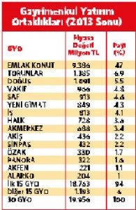 Sermaye Piyasası Kurulu (SPK) verilerine göre, 2013 sonu itibariyle 30 GYO’nun aktif büyüklükleri 37.5 milyar, 2013 sonu piyasa değeri de 20 milyar TL’yi buldu.