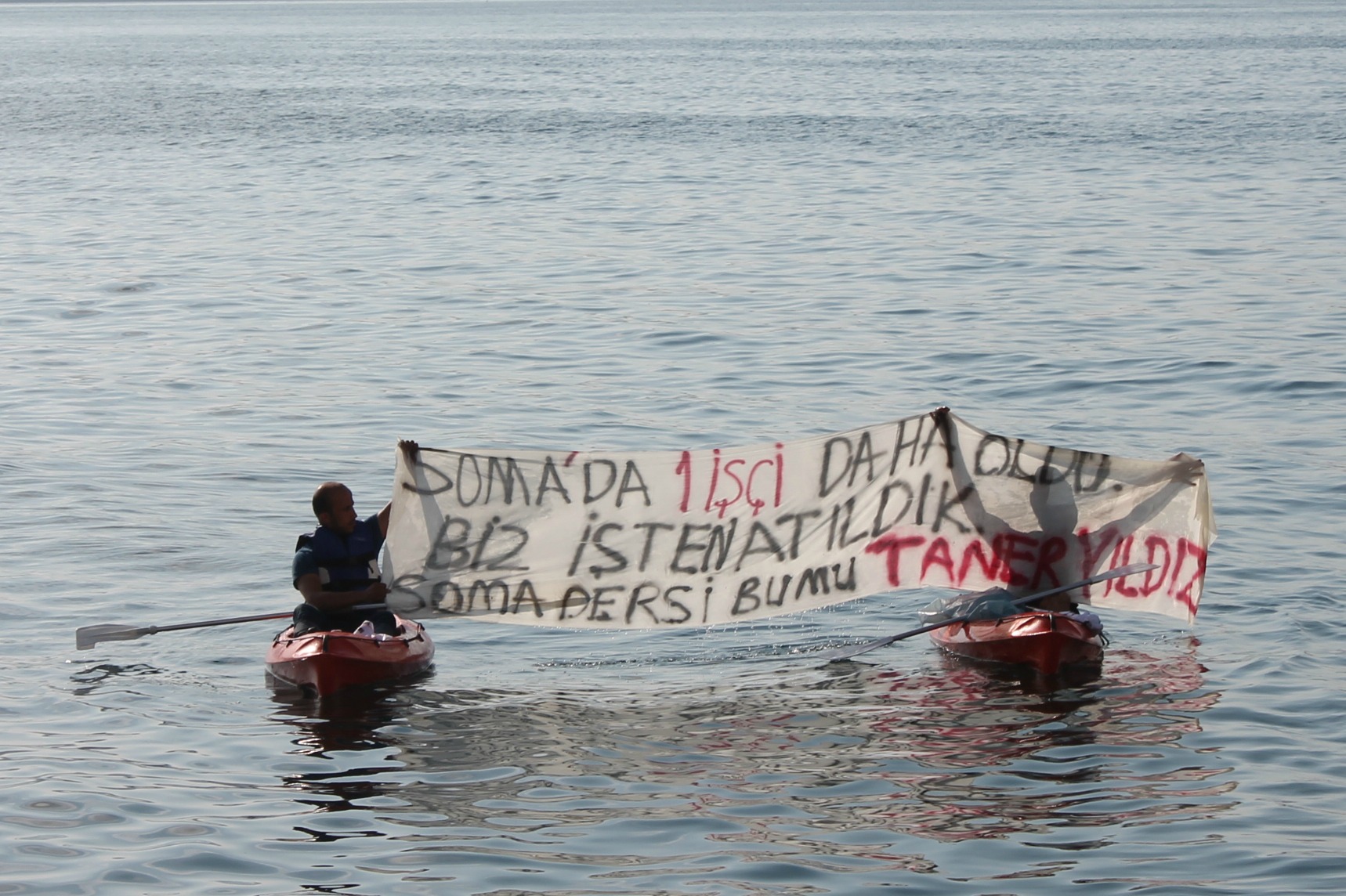 Enerji Sen üyeleri yaptıkları eylem sırasında denize kano ile açılarak, Soma’da yaşanan iş cinayetini açtıkları pankartla bakan Taner Yıldız’a sordu.