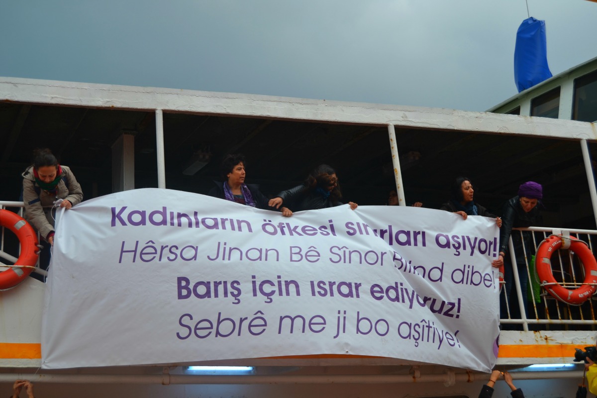 Avrupa yakasında Beşiktaş iskelesinde bir araya gelen kadınlar, vapurla Kadıköy’e geçti. Vapurdan “Kadınların öfkesi sınırları aşıyor, barış için ısrar ediyoruz” yazılı pankart sallandıran kadınlar, “IŞİD’e karşı kadın dayanışması”, “Diren Kobanê İstanbul seninle” sloganlarıyla Kadıköy iskelesinde bekleyen kadınlarla buluştu.
