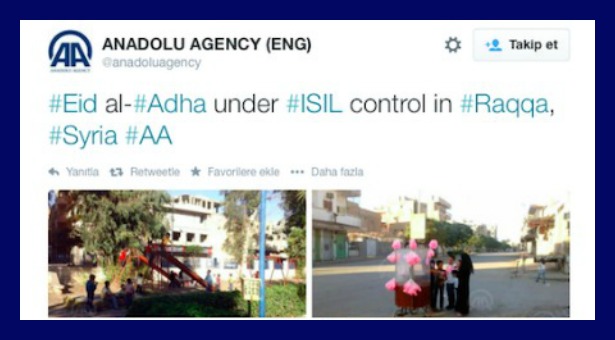 AKP gerek askeri gerek politik olarak IŞİD’e desteğini sürdürürken, Anadolu Ajansı (AA) da cihatçıların yayın organı niteliğindeki haberlerine devam etti. Öğle saatlerinde IŞİD’in Suriye’deki merkez üssü Rakka ile ilgili Twitter’daki İngilizce sayfasından fotoğraflar geçen AA, “Rakka’da bayram” vurgulu mesajında IŞİD çeteleri yerine parkta oynayan çocuk resimleri paylaştı.