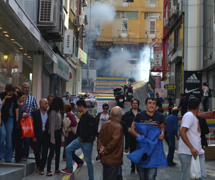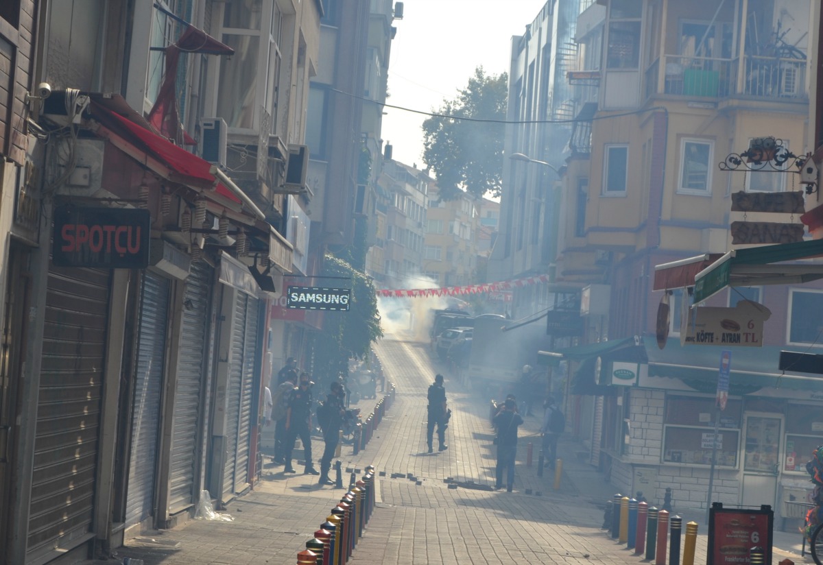 Eylemde ”Katil IŞİD, İşbirlikçi AKP” sloganları atıldı. AKP ilçe binasına yürümek isteyen eylemcilere polis gaz bombaları ve tazyikli suyla saldırdı. Polis ara sokaklara çekilen eylemcilere gazla saldırmaya devam etti. Saldırılara karşı birkaç ara sokakta eylemciler barikat kurdu.
