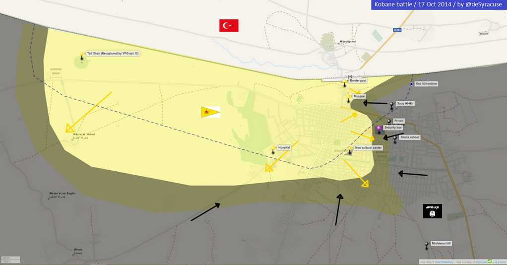 Türkiye IŞİD’i, PKK – PYD ve Esad’a göre daha az kötü olanlar olarak değerlendiriyor. Suriye’de neredeyse bağımsız bir Kürdistan’ın kurulması PKK’ye kıyas kabul etmez bir temel sağlar ki bunu, Kürt çatışmasını bitirmeye uğraşan Ankara asla istemez. Kürtler Türk ordusunu Kobanê’ye destek olabilecek her şeyi engellemekle ve bunun yanı sıra Orta Asya ve Batı’dan gelen cihatçıların geçişine göz yummakla suçluyor. 14 Ekim Salı günü ise Türk uçakları PKK alanlarını bombaladı.
