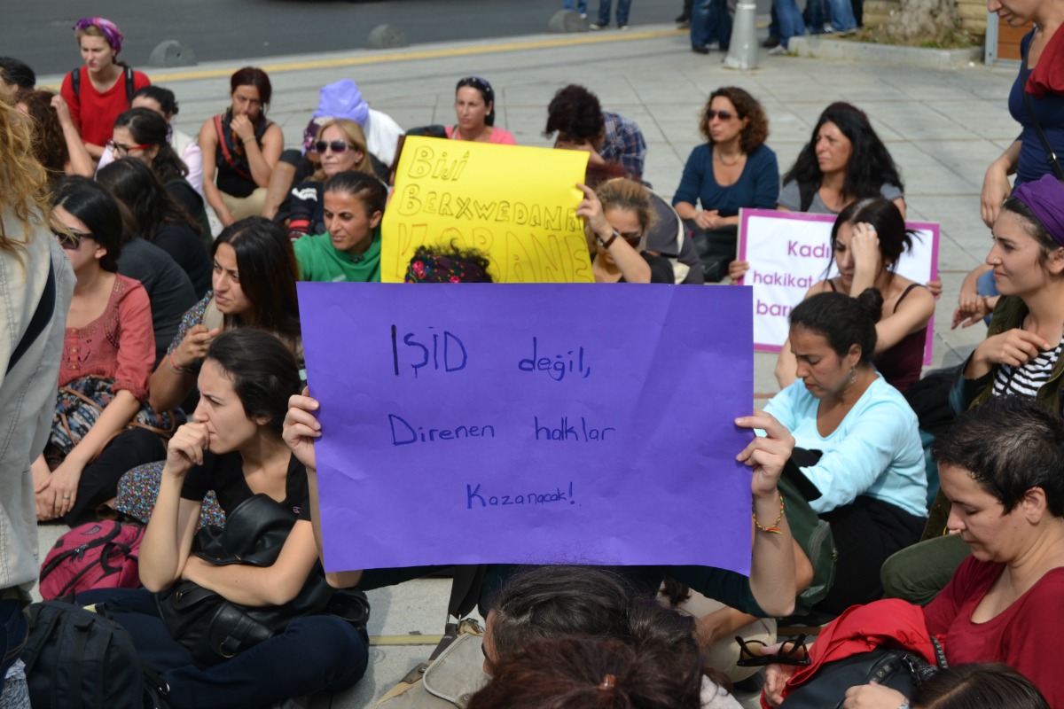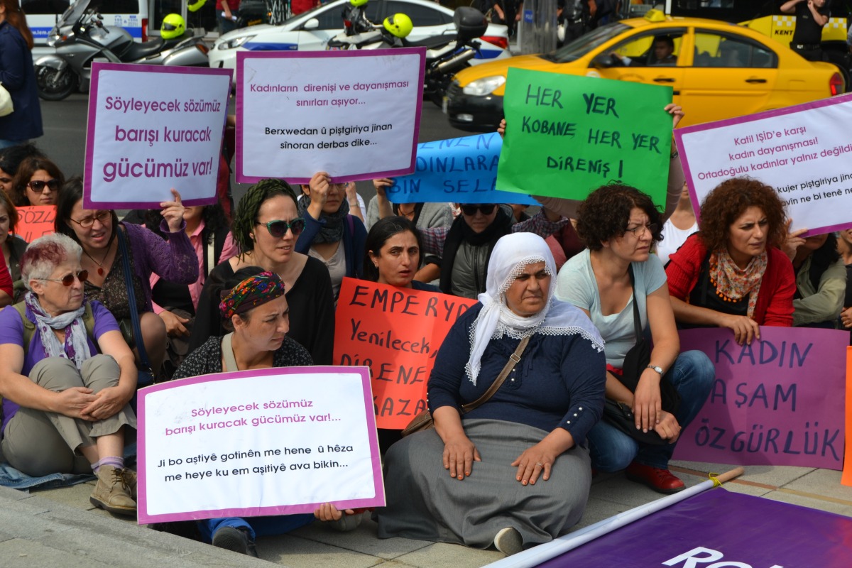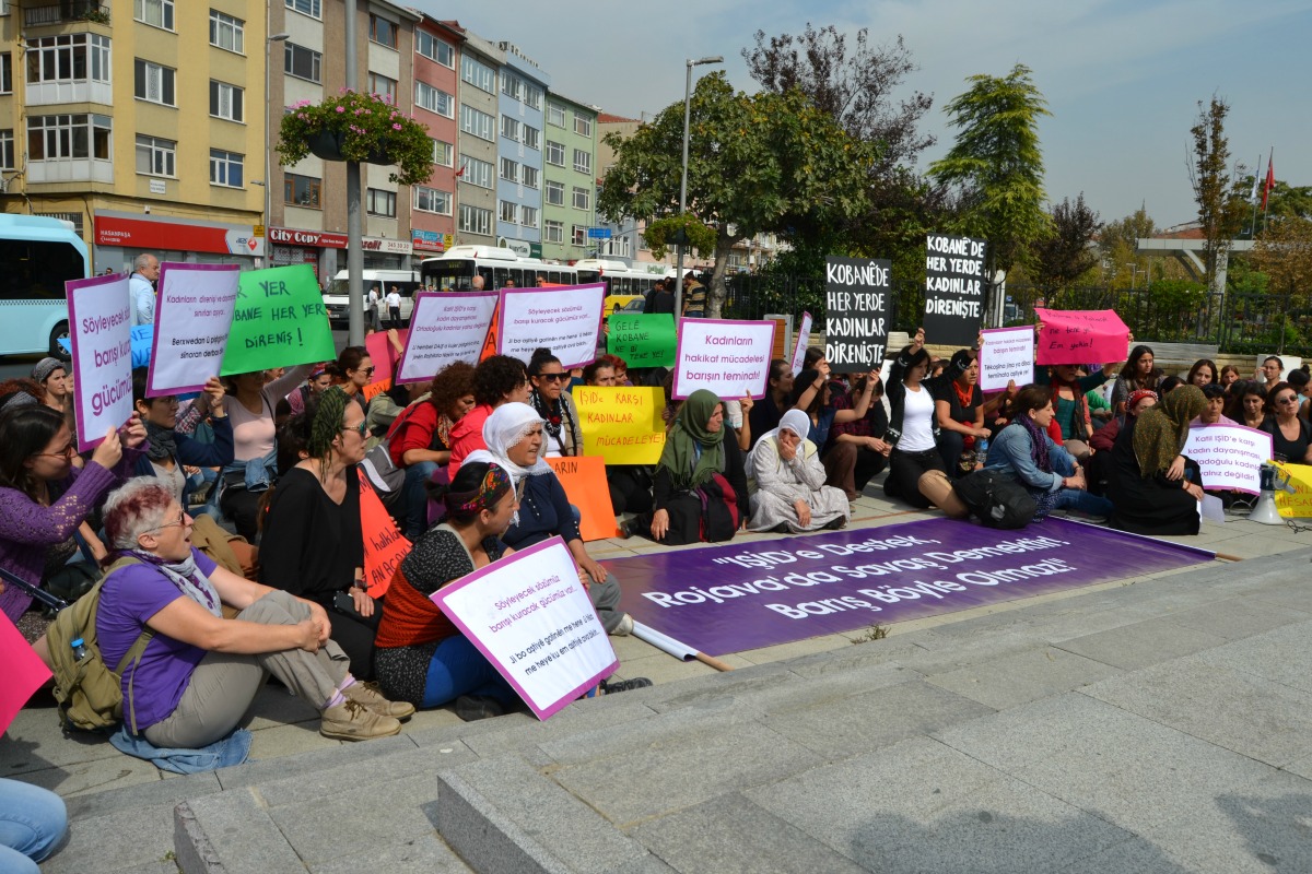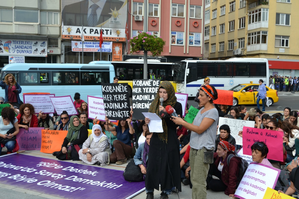 Barış İçin Kadın Girişimi’nin çağrısıyla Suruç’a giden ve Kobané’de IŞİD saldırılarına karşı dayanışma için sınırda iki gün nöbet eylemi gerçekleştiren ve çadır kentleri ziyaret eden kadınlar İstanbul’a döndü. AKP Kadıköy ilçe binasının önünde basın açıklaması yaptı. Ardından Altıyol’dan Boğa Meydanı’na yürüyen kadınların önüne polis barikat kurdu