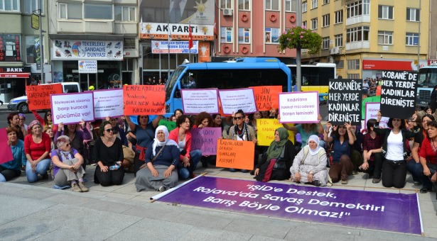 3 Ekim’de Barış İçin Kadın Girişimi’nin (BİKG) çağrısıyla, İstanbul’dan Rojava sınırına giden feminist, sosyalist, anarşist gruplardan, Kürt hareketinden, demokratik kitle örgütlerinden 3 otobüs dolusu kadın bugün (7 Ekim) İstanbul’a döndü. Kadıköy AKP ilçe binası önünde basın açıklaması yapan kadınlar ‘‘Kobané’de IŞİD’e destek vererek Türkiye’de ve Kürdistan’da barış olmaz’’ dedi.