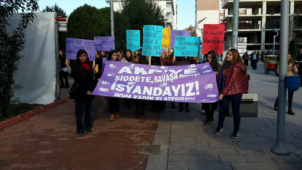 ‘AKP’ye, şiddete, savaşa karşı isyandayız’ diyen Hopalı Kadınlar 24 Kasım’da sokaktaydı. Hopa Parkı’ndan buluşan kadınlar şehir merkezinde yürüyüş yaptı. 25 Kasım Kadına Yönelik Şiddete Karşı Uluslar arası Mücadele ve Dayanışma Günü için sokağa çıkan kadınlar eylemlerini horonlarla sonlandırdı.