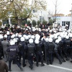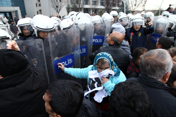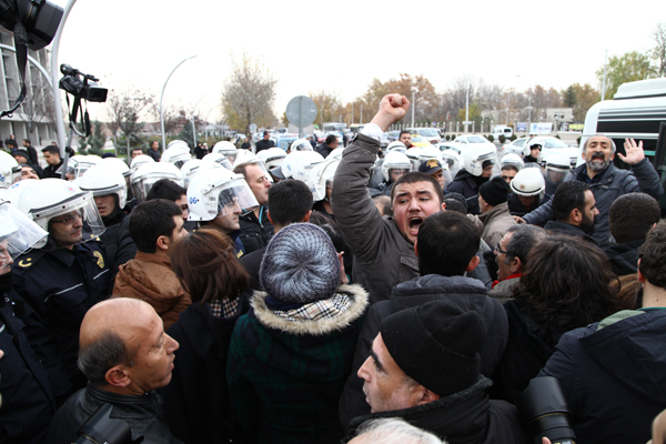 Dikmen Vadisi’ndeki kentsel dönüşüm projesini hayata geçirmek için 9 yıldır her türlü saldırı yöntemini deneyen Melih Gökçek’in ihale taktiğini devreye sokması üzerine Vadi halkı soluğu Büyükşehir Belediyesi önünde aldı. “Bu ihaleyi yaptırmayacağız” diyen Vadililer, saat 13.00’dan itibaren belediye binasının önünde bir araya gelmeye başladı. Aralarında Genel Başkan Yardımcısı Samut Karabulut’un da olduğu Halkevleri üyeleri de Vadi halkını yalnız bırakmadı. Bölge halkı ihalenin yapıldığı yere girmeye çalıştı ancak Büyükşehir Belediyesi binası önüne barikat kuran polis tarafından engellendi.