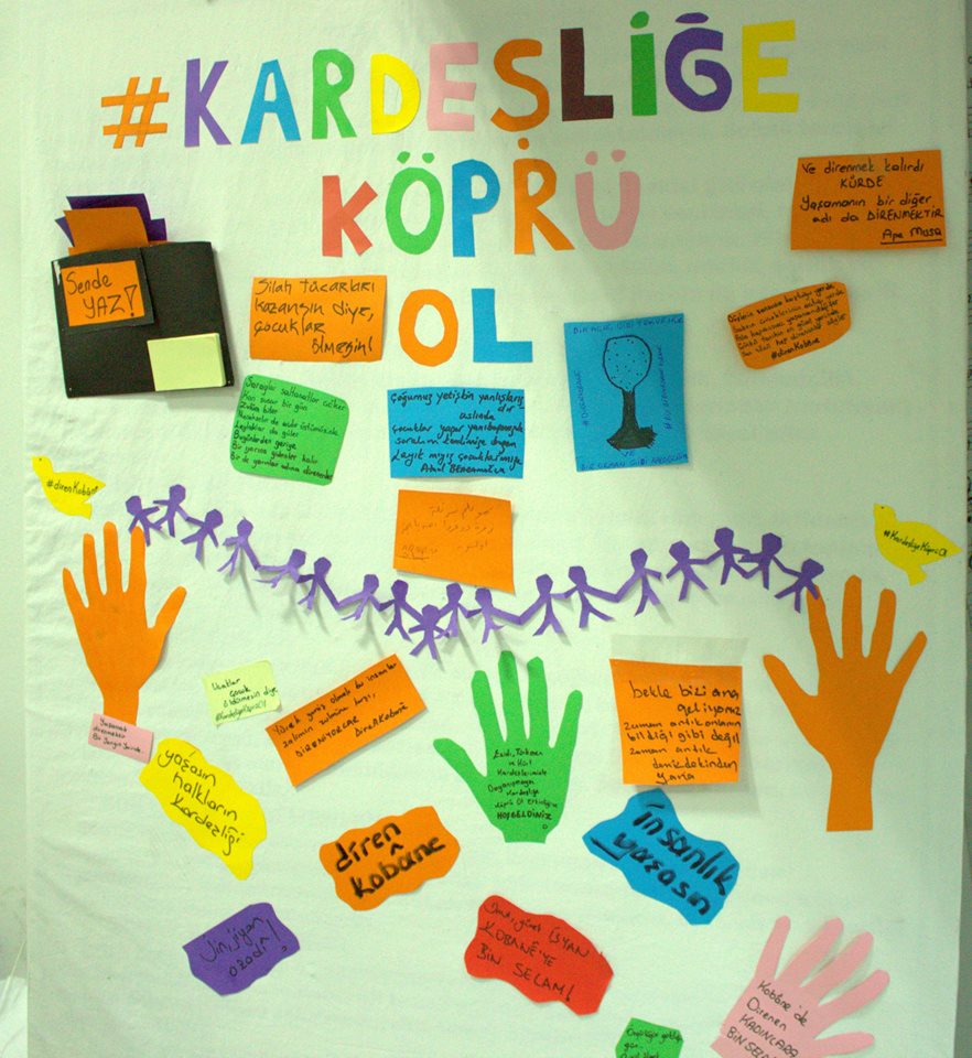 İzmir’de kardeşliğe köprü ol diyen yüzlerce kişi Halkevleri’nin çağrısıyla konserde yan yana geldi. Ezidi, Türkmen ve Kürt halkıyla dayanışma için gerçekleştirilen etkinliğe girişler turuncu stantlarda yardımların toplanmasıyla başladı. Şarkılarıyla, oyunlarıyla “Barışa sanat” diyen 11 ayrı gönüllü sanatçının yer aldığı konserde İzmir’den Ortadoğu halklarına kardeşlik köprüsü kuranların mesajı: “Direnişi ve dayanışmayı büyütecek, kardeşliğin ülkesini kuracağız” oldu
