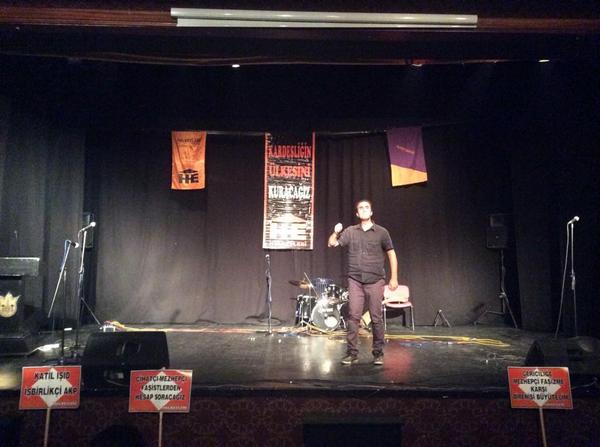 Saygı duruşunun ardından Halkevleri Ege Bölge Temsilcisi Mesut Baybüke etkinliğe gelenleri selamlamak için sahnede yerini aldı. Baybüke etkinliğe katılarak dayanışmayı büyüten İzmir halkını ve sanatçılarını selamlayarak sözlerine başladı. “Bizler biliyoruz ki AKP’nin kaderi cihatçı çetelerle, bizim kaderimiz bu çetelere direnen halklarla Kobane’yle Rojova’yla ortak.” diyen Baybüke, herkesi savaş politikalarına, mezhepçi faşizme ve cihatçı katillere karşı direnişi yükseltmeye ve cihatçılara karşı direnen, cihatçıların zulmünden kaçıp Türkiye’ye sığınan kardeş halklara dayanışma elini uzatmaya çağırdı. Ülkenin dört bir yanında düzenlenen yardım kampanyasıyla Ezidi, Türkmen ve Kürt halkıyla dayanışmaya devam edeceklerinin altını çizen Baybüke şöyle devam etti: “Bizler o çok korktukları sokaklarda mezhepçi faşizme karşı, cihatçı çeteleri ve AKP’yi bu topraklardan söküp atıncaya kadar mücadele edeceğiz. Direnişi ve dayanışmayı ilmek ilmek örerek kardeşliğin ülkesini kuracağız.”