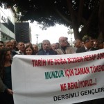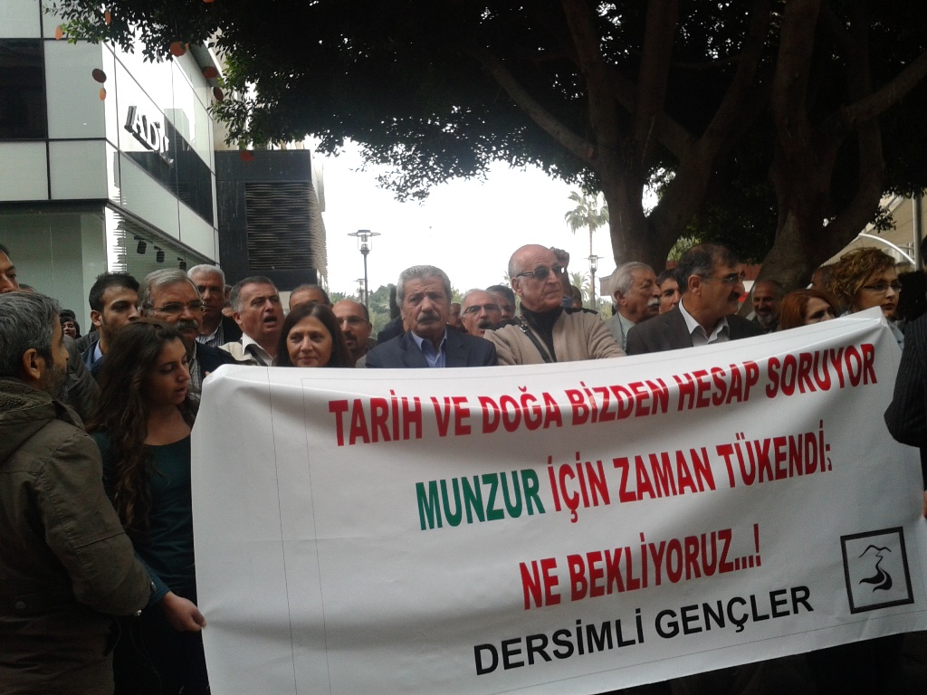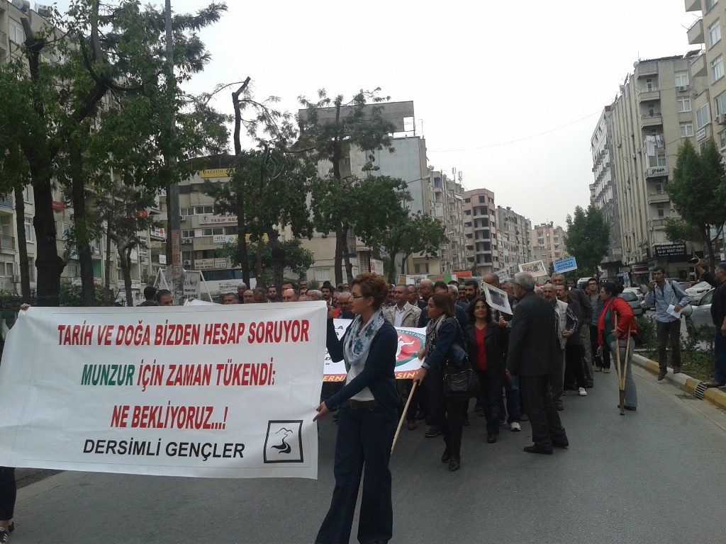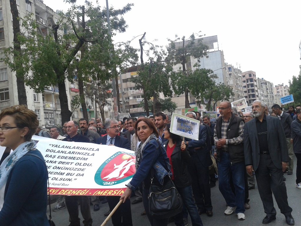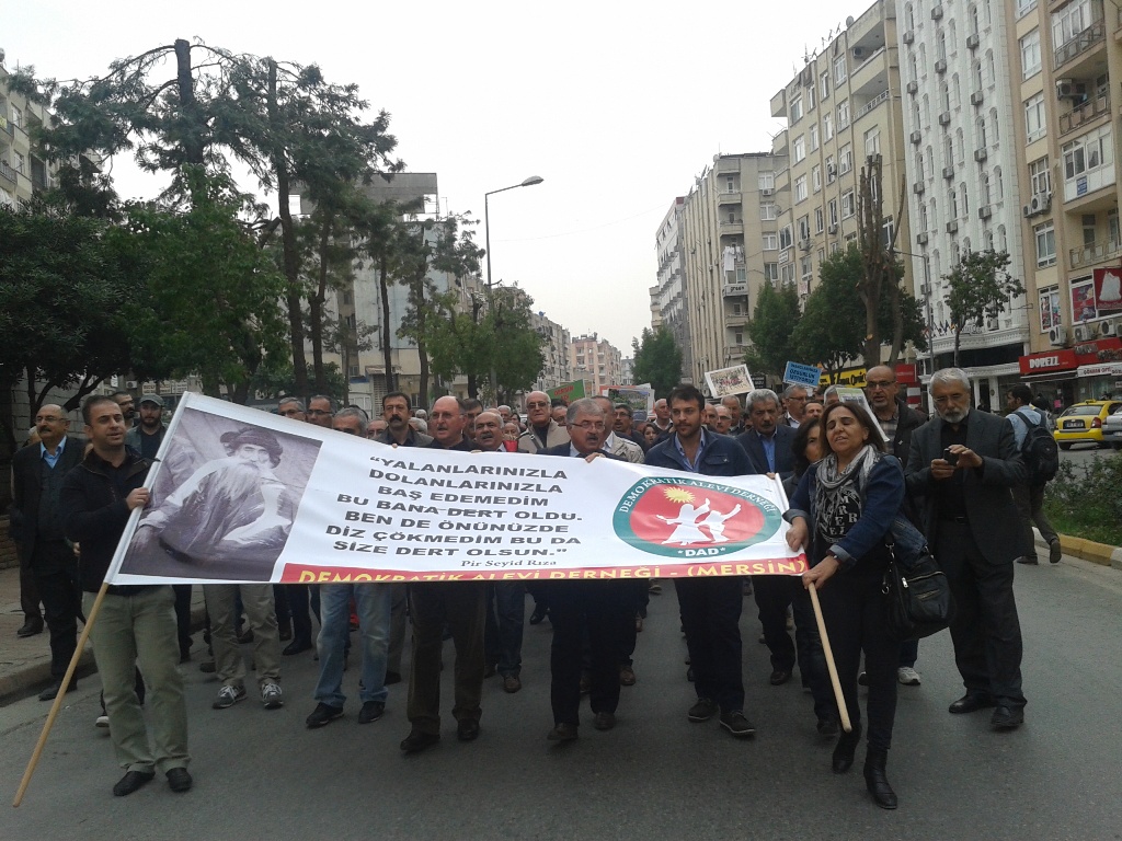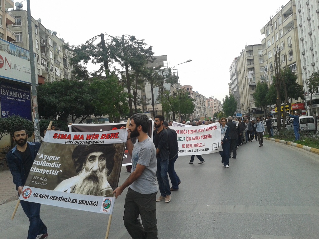 Pir Seyit Rıza’nın “Yalanlarınızla dolanlarınızla baş edemedim bu bana dert oldu, ben de önünüz de diz çökmedim bu da size dert olsun” sözünün yazıldığı bir pankart açarak “Devrim şehitleri ölümsüzdür” ve “Katil devlet hesap verecek” sloganları atan Mersinliler Özgür Çocuk Parkı’nda bir araya gelerek Taş Bina önüne yürüyüş gerçekleştirdiler.