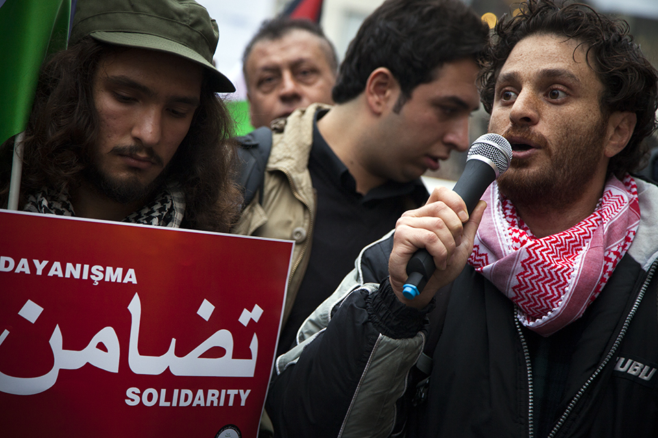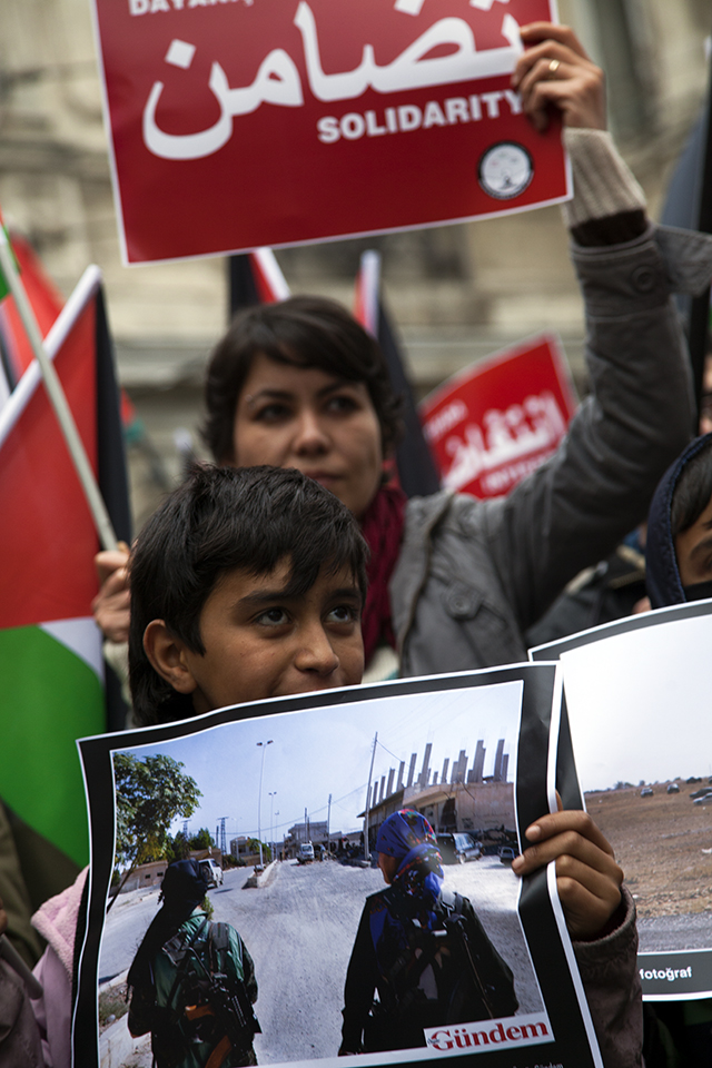“Tanklara karşı taş, tanklara karşı taş , direnen Filistin kazanacak”, “Diren Filistin seninleyiz” sloganlarının atıldığı yürüyüş sonunda, Filistin İçin İsrail’e Boykot Girişimi adına Ayşe Düzkan basın açıklaması metnini okudu.