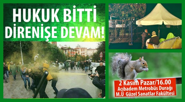 Binlerce İstanbullunun direniş alanına aktığı 29 Ekim Pazar günü aniden mahkemenin yürütmeyi durdurma kararının varlığını idrak edip, mahalle sakinlerine karara uyacağını beyan ederken bile yanıltıcı demeçler vermeyi sürdüren yağmacılar, 30 Ekim akşamı İBB Başkanı Kadir Topbaş’ın acele demeciyle hukuksuzluğu hukuk kılığında karşımıza çıkardılar: “Yürütmeyi durdurma kararı iptal edildi. Mahkeme kararına uymak zorundayız”. Yaklaşık 10 gündür ortalarda görünmeyen Üsküdar Kaymakamı da bu demecin ardından dünkü açıklamadan sonra etrafındaki polis ablukası bir nebze bile azalmamış olan, tersine yeni baskılar yüzünden elektrik ve tuvalet olanaklarından yoksun bırakılan direniş alanında boy gösteriverdi.