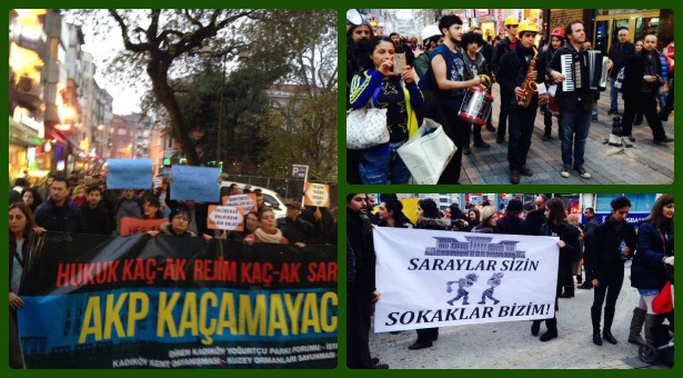 “Hukuk kaç-ak, rejim kaç-ak, saray kaç-ak, AKP kaçamayacak!” pankartını taşıyan eylemciler, Kadıköy Boğa Heykeli önünde toplandı. Yürüyüş Hürriyet Bandosu’nun çaldığı Çav Bella marşı ile başladı.