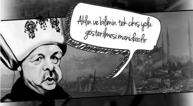 Afişte padişah kavuğu giymiş Tayyip Erdoğan ve içinde Erdoğan’ın geçtiğimiz günlerde Din Şurası’nda sarf ettiği “Aklın ve bilimin tek çıkış yolu gösterilmesi manidardır” sözleri yer alıyor.